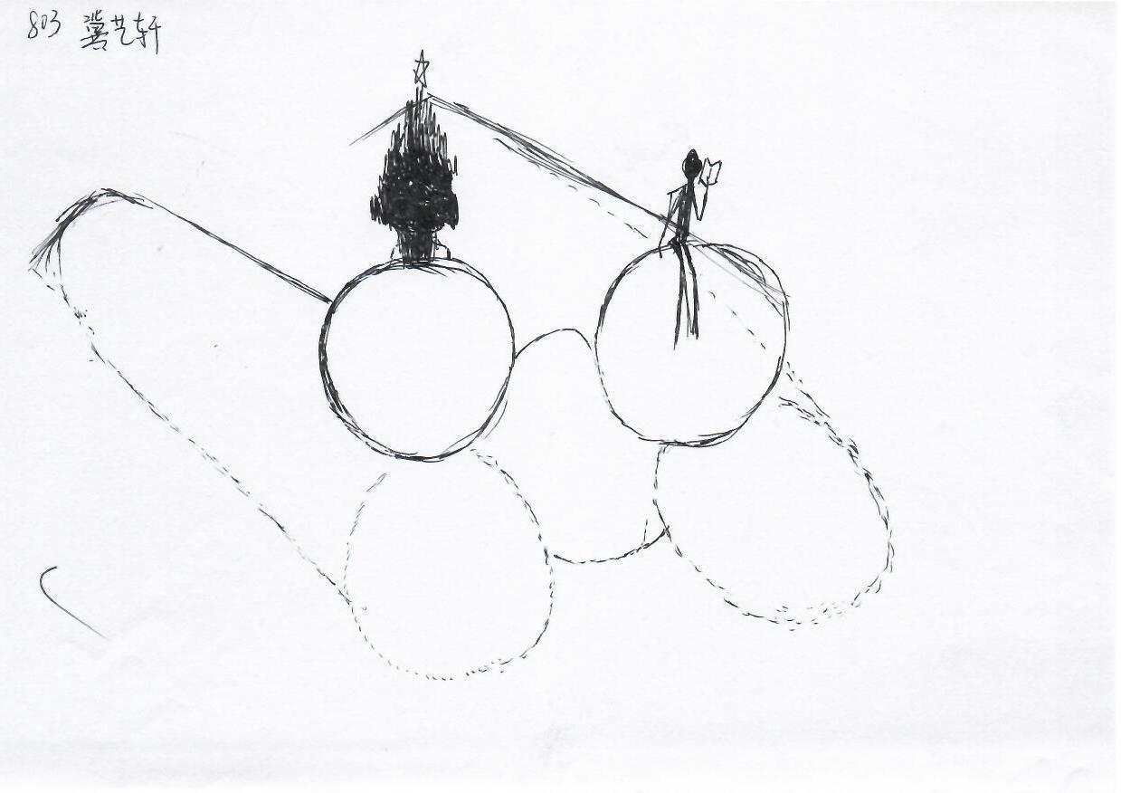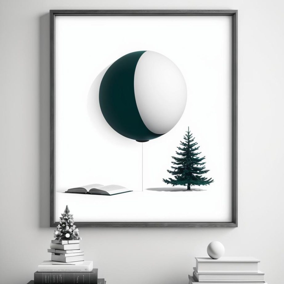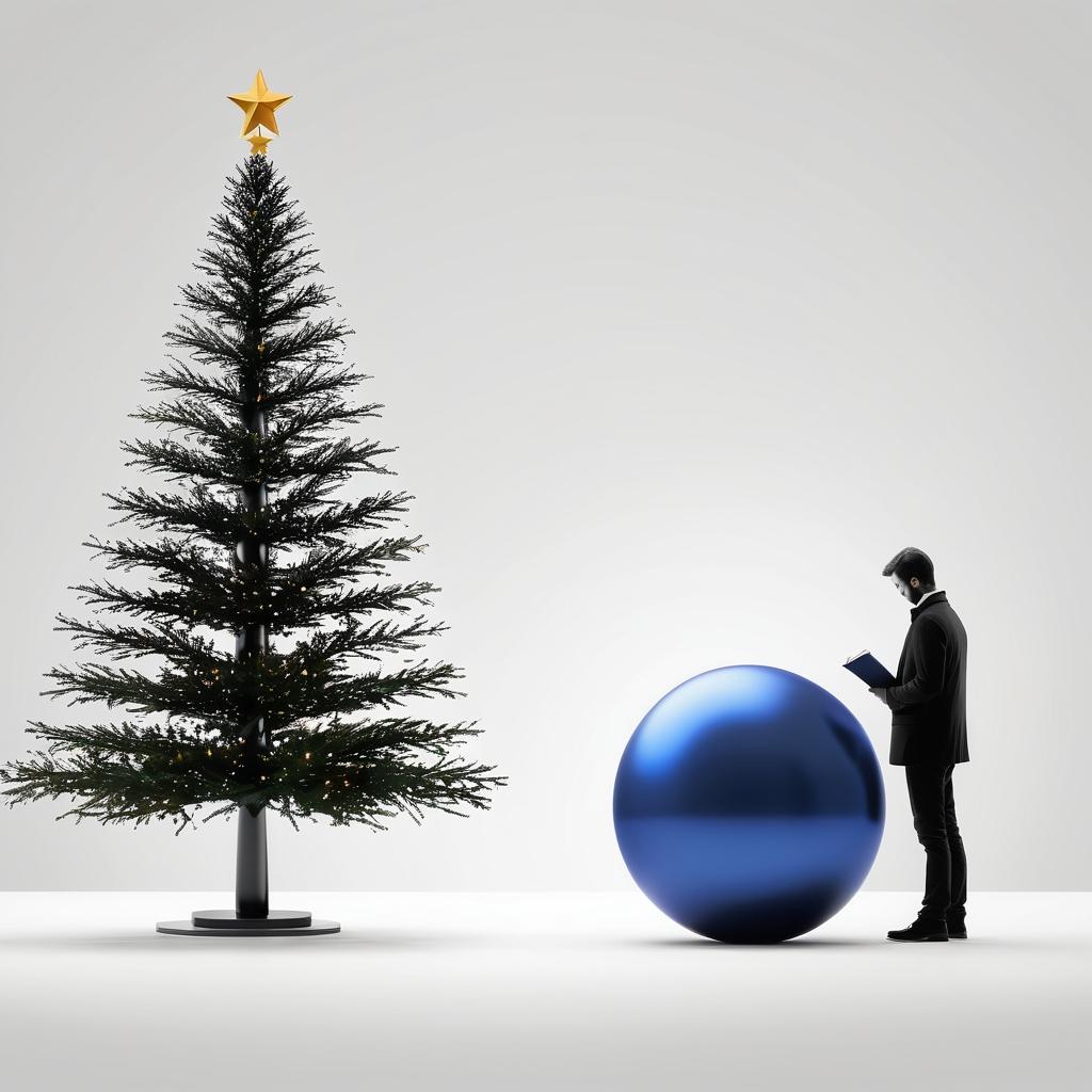 这幅作品采用简洁的线条勾勒出两个球体,分别上方是一个圣诞树和一个阅读的人物。作品中用简约的黑白色调传达了一种宁静和思考的情感。整个构图呈现出一种平衡,似乎在表现节日的氛围与个人沉思之间的对比。