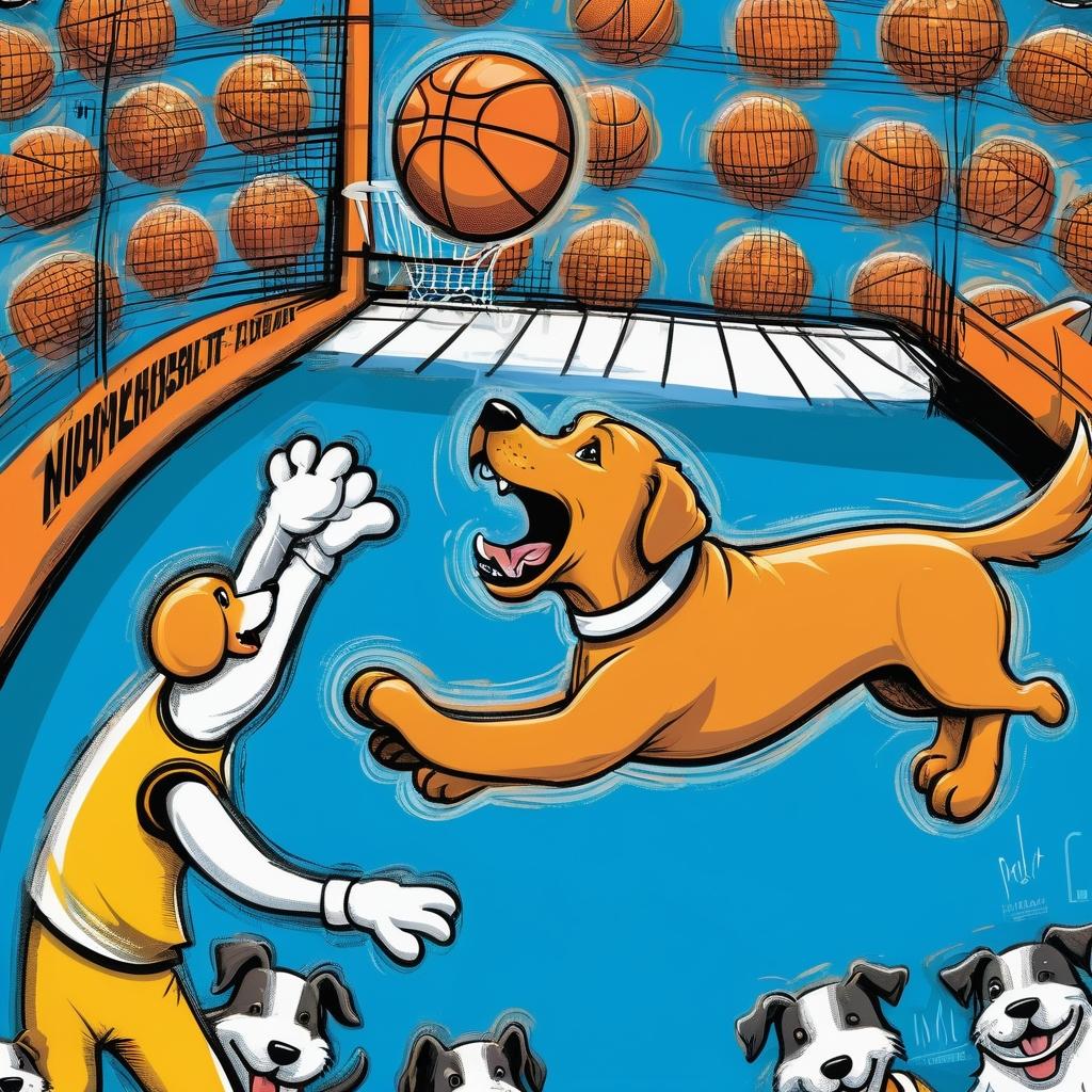 这幅作品以其鲜明的卡通风格和幽默的主题,吸引了众多观众的目光。通过简单的线条和淡雅的颜色,创作者成功地将一只拟人化的狗置于一个充满活力的篮球场景中。狗的动作和表情都充满了生命力,仿佛下一秒就会跃起完成一次精彩的扣篮。这种创作不仅展示了艺术家的想象力,也反映了他们对生活中小事的热爱和幽默感。