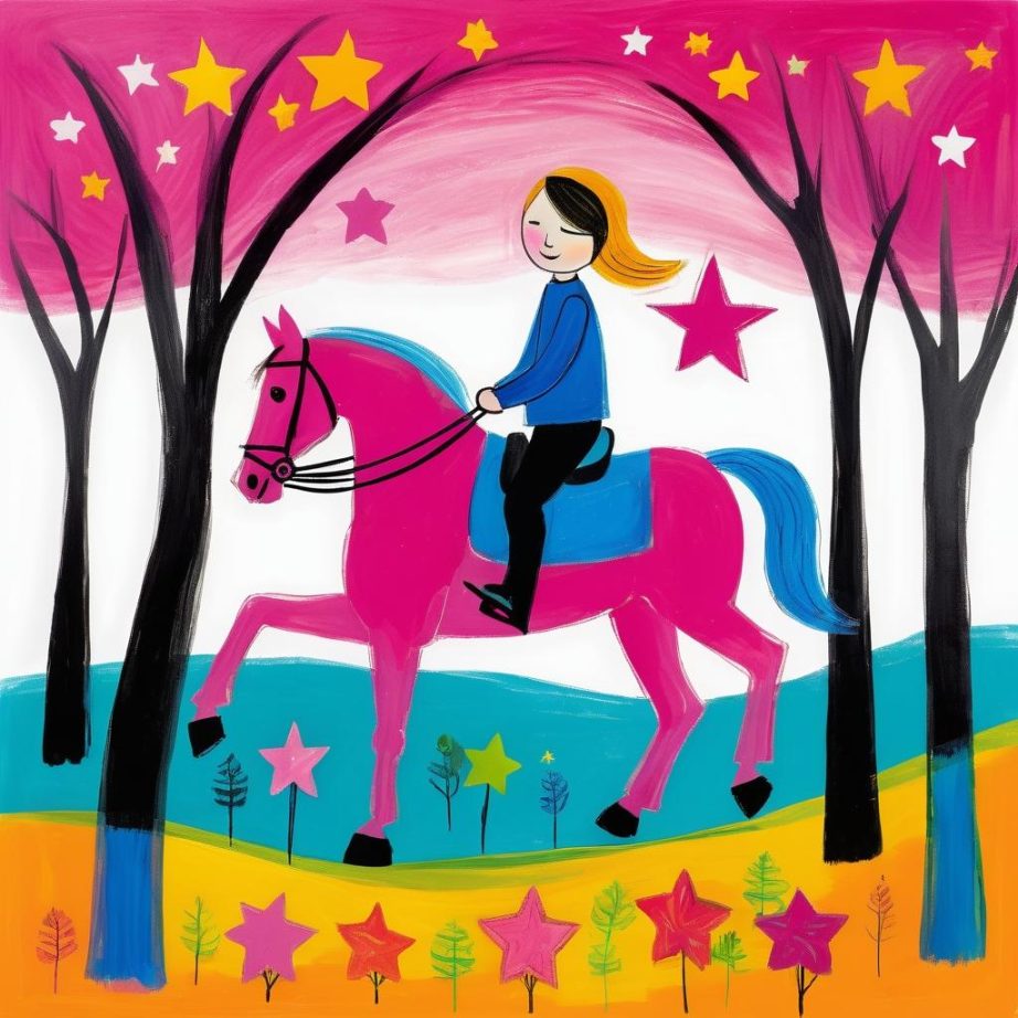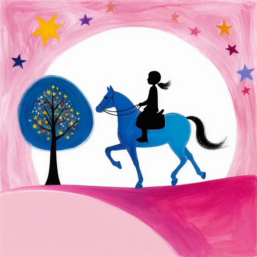这幅作品展示了一种孩童般的天真与自由,使用简单的线条勾勒出一个骑在马上的人形,背景中似乎有星星或者是树木的形状。作品的粉色背景给人一种温暖和柔和的感觉。整体构图简洁,传达了一种轻松愉快的情感。
