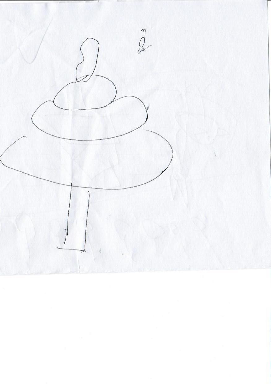 这幅画作中采用了简单的线条和形状,构成了一个类似蛋糕或塔形的结构。画面中缺乏色彩,采用了简洁的黑白对比,呈现出一种极简主义风格。作品传达了一种轻松随性的情感,可能意在表达一种原始的创造力或孩童般的想象力。