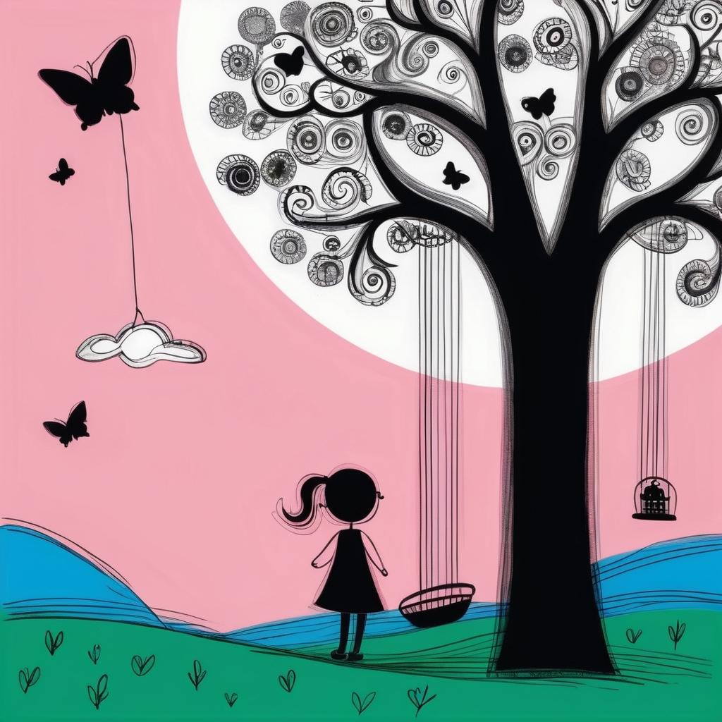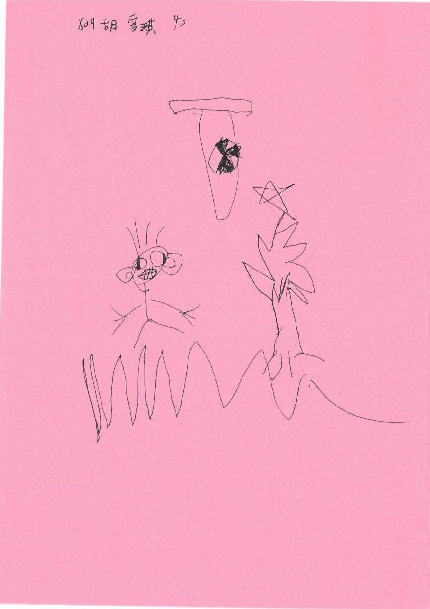 这幅充满童趣的画作展示了孩子们天马行空的想象力。粉色的纸张为背景,黑色的线条勾勒出一个夸张表情的小人、一颗充满个性的树,以及一个悬挂于空中的神秘物体。这些元素共同构成了一幅简洁却富有生命力的图景,仿佛让我们窥见孩子们心中那个奇妙的世界。