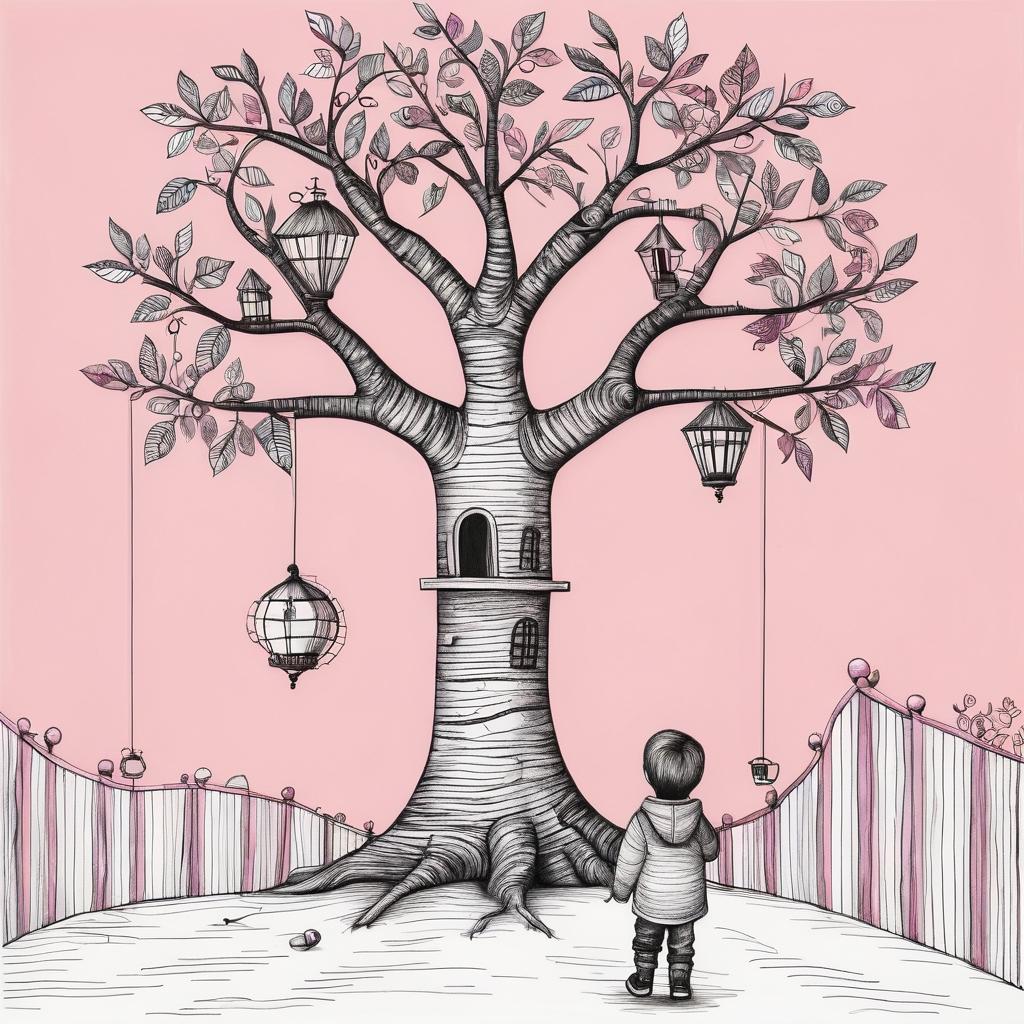 这幅作品展现了孩童无拘无束的创造力和表达能力。粉色的背景为画面增添了一丝温暖和柔和的感觉,而黑色线条则显示出孩子对形状和结构的初步理解。为了提升这幅作品,可以考虑引导孩子使用更多的颜色,探索不同的色彩搭配如何改变画面的情感表达。同时,可以鼓励他们在细节上增加表现力,例如在树的形状上添加更多的枝叶,或者在小人身上增加衣服的细节。这样的改进不仅能帮助孩子更深入地理解艺术创作的多样性,还能增强他们的观察能力和想象力。