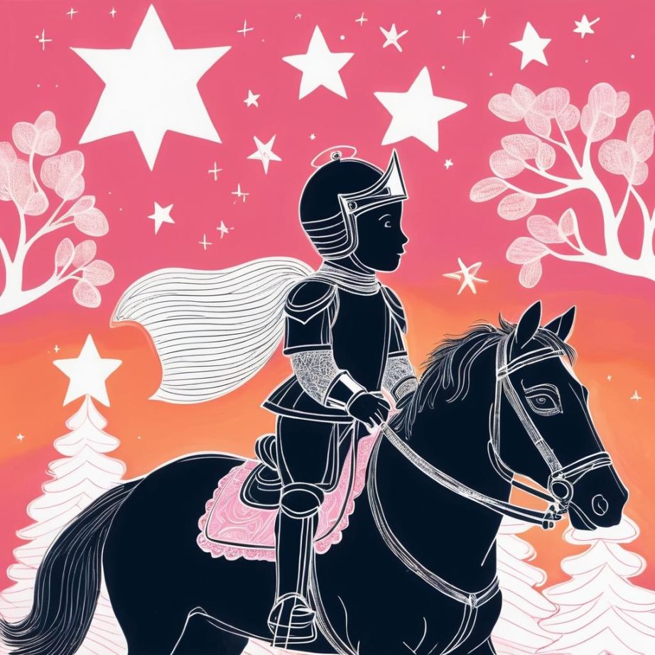 这幅作品使用了简单的线条在粉色背景上勾勒出骑马的人物和背景元素。线条随意且富有童趣,可能反映了创作者的无拘无束和想象力。作品的主题似乎是骑士与自然,营造了一种梦幻和自由的氛围。