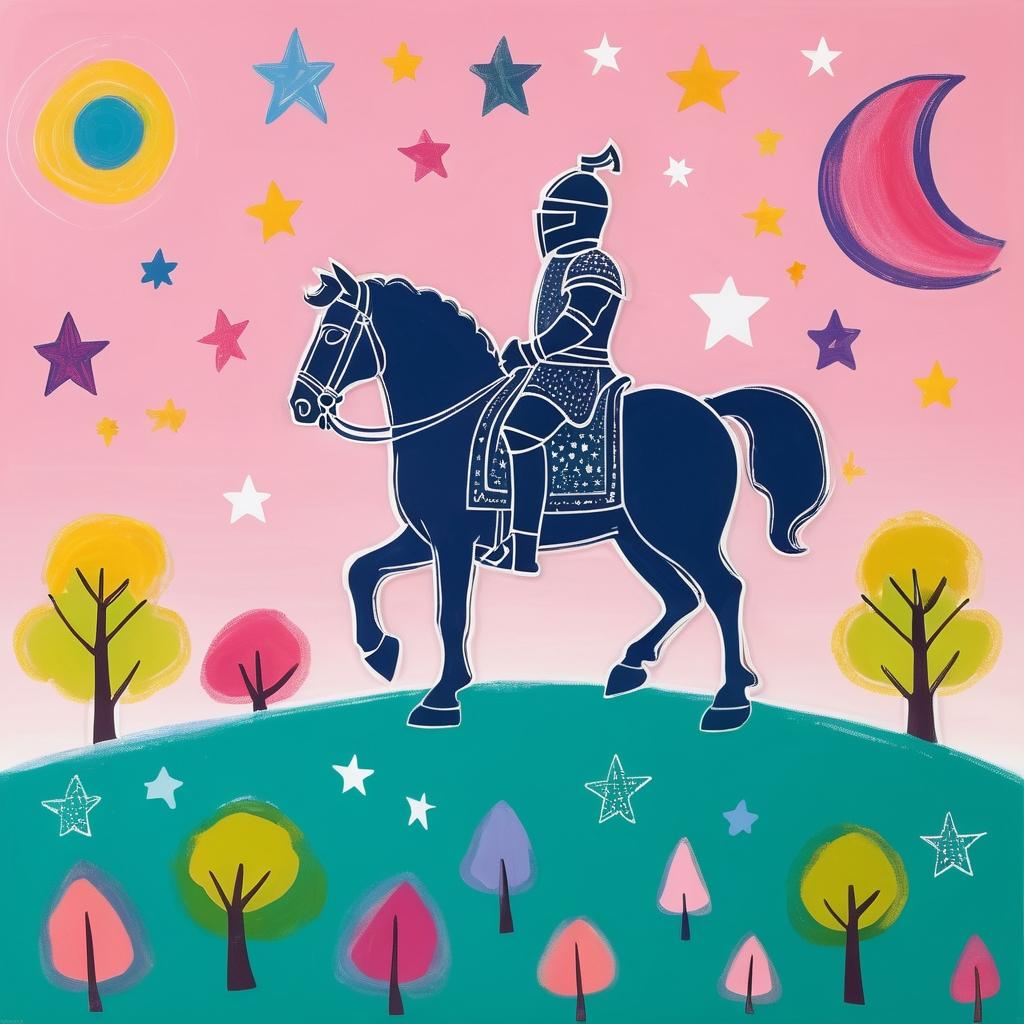 这幅作品通过简单的线条和形状展现了儿童艺术的无拘无束与创意。粉色背景为这幅画增添了一丝梦幻感,而线条勾勒出的骑士形象则唤起了童年的遐想。孩子们常常用这种直接而纯粹的方式表达他们的想法,这种未经雕琢的艺术形式被称为幼稚艺术(Naive Art)。在这幅图中,骑士与自然的结合,传达了一种自由与探索的精神。