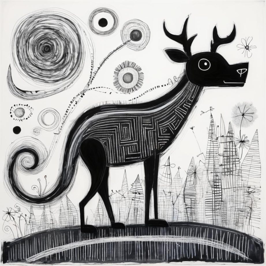 这幅画是用铅笔简单勾勒的儿童画作品。主要元素包括一个抽象的生物,可能是一只动物,旁边有一些不规则的图形和符号。整体呈现出天真和自由的绘画风格,表达了儿童的创造力和想象力。作品中的线条随意而流畅,给人一种轻松和欢乐的感觉。
