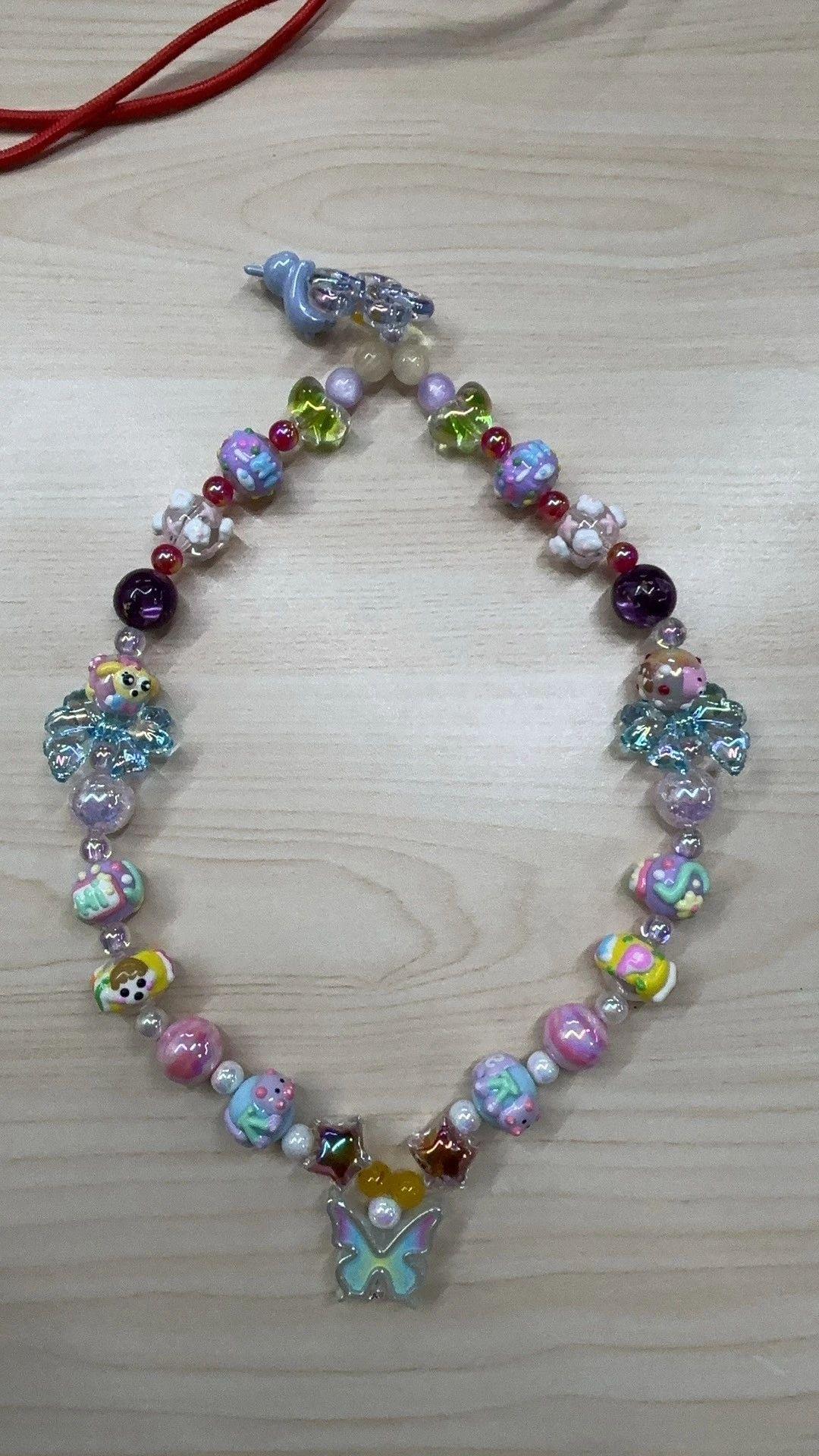 图片中的串珠饰品由多种类型的珠子组成,包括塑料珠和陶瓷珠。珠子的形状多样,有圆形、立体卡通形状和不规则形状。颜色丰富多彩,以粉色、紫色、黄色为主,搭配鲜艳的图案。珠子的数量和排列方式呈现出一种非对称的趣味风格。