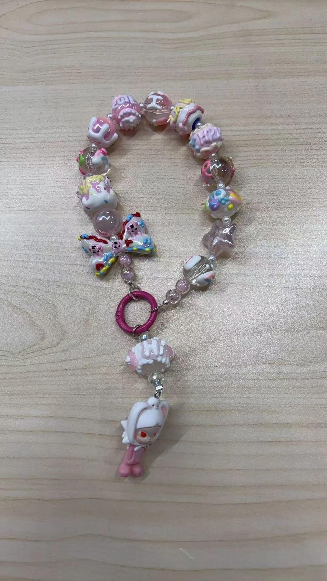 该图片展示了一条色彩缤纷的串珠手链。主要使用的串珠包括带有可爱图案的塑料珠(如甜点、星星形状等),颜色以粉红色为主,辅以白色、黄色和蓝色。整体排列呈现出不对称的组合,中心有一个显眼的粉色圆环,连接了一个玩偶吊坠。