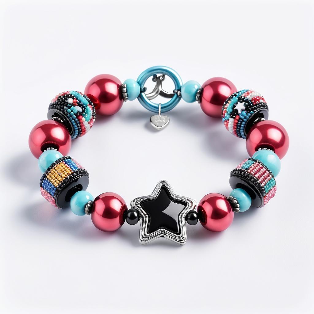 这条手链以其童趣和色彩丰富的设计脱颖而出。通过分析,我们注意到其使用了多种形状和颜色的串珠,包括甜点和星星形状的塑料珠子,形成了一种不对称但吸引眼球的组合。粉色和白色的主色调搭配其他色彩形成鲜明对比,使整体设计充满活力。中心的粉色圆环和玩偶吊坠成为视觉焦点,增添了趣味性。在设计中,可以通过增加金属元素和重新排列串珠,进一步提升艺术性和功能性。结合当前年轻人喜爱的设计趋势,这种手链不仅是装饰品,更是一种自我表达的方式。