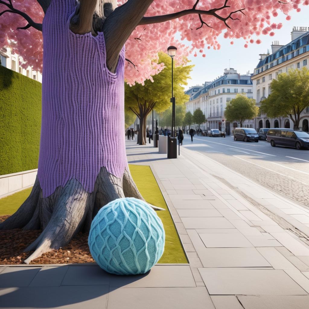 这张图片展示了一棵树干被柔和的粉色、紫色、蓝色和白色的针织物包裹着,表面有几颗小球装饰。背景是城市街道,光线明亮,营造出一种温暖和谐的感觉。作品可能传达了一种保护自然或为城市增添趣味的主题。