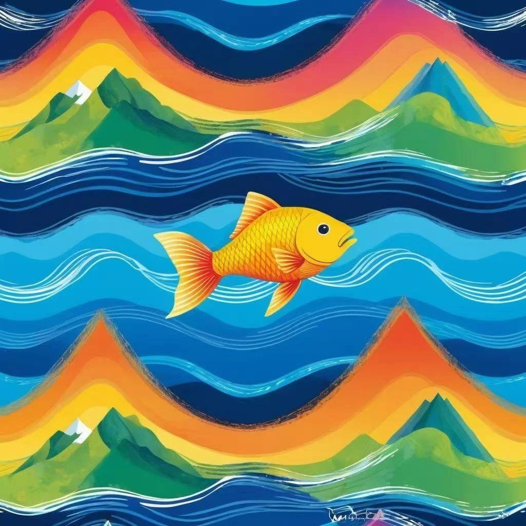 这幅作品展现了一个色彩斑斓的景象,主要元素包括一条金鱼、波浪形状的水流和背景中的山脉。色彩鲜艳,使用了蓝色、绿色、橙色和黄色等,使整个画面充满活力和动感。鱼的形象象征着自由和希望,而流动的波浪和远处的山脉则传递出自然的宁静与和谐。这幅作品可能想表达对自然的敬仰以及生命的自由自在。