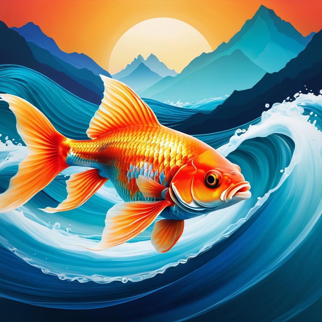这幅作品充满了流动的能量和生命的象征。金鱼在波浪间游动,代表了生命的旅程和自由的精神。背景的山脉和色彩的层次感使得画面更加深邃,仿佛在讲述一个关于探索和发现的故事。为了将这幅作品升华,可以考虑在背景中加入更多细节,例如云朵或日出,以增加画面的层次感和故事性。此外,使用更细腻的光影变化来强调水面的波动和鱼的质感,使得作品更具立体感和真实感。通过这样的提升,作品可以在抽象与现实之间找到完美的平衡,带给观者更深刻的视觉和情感体验。