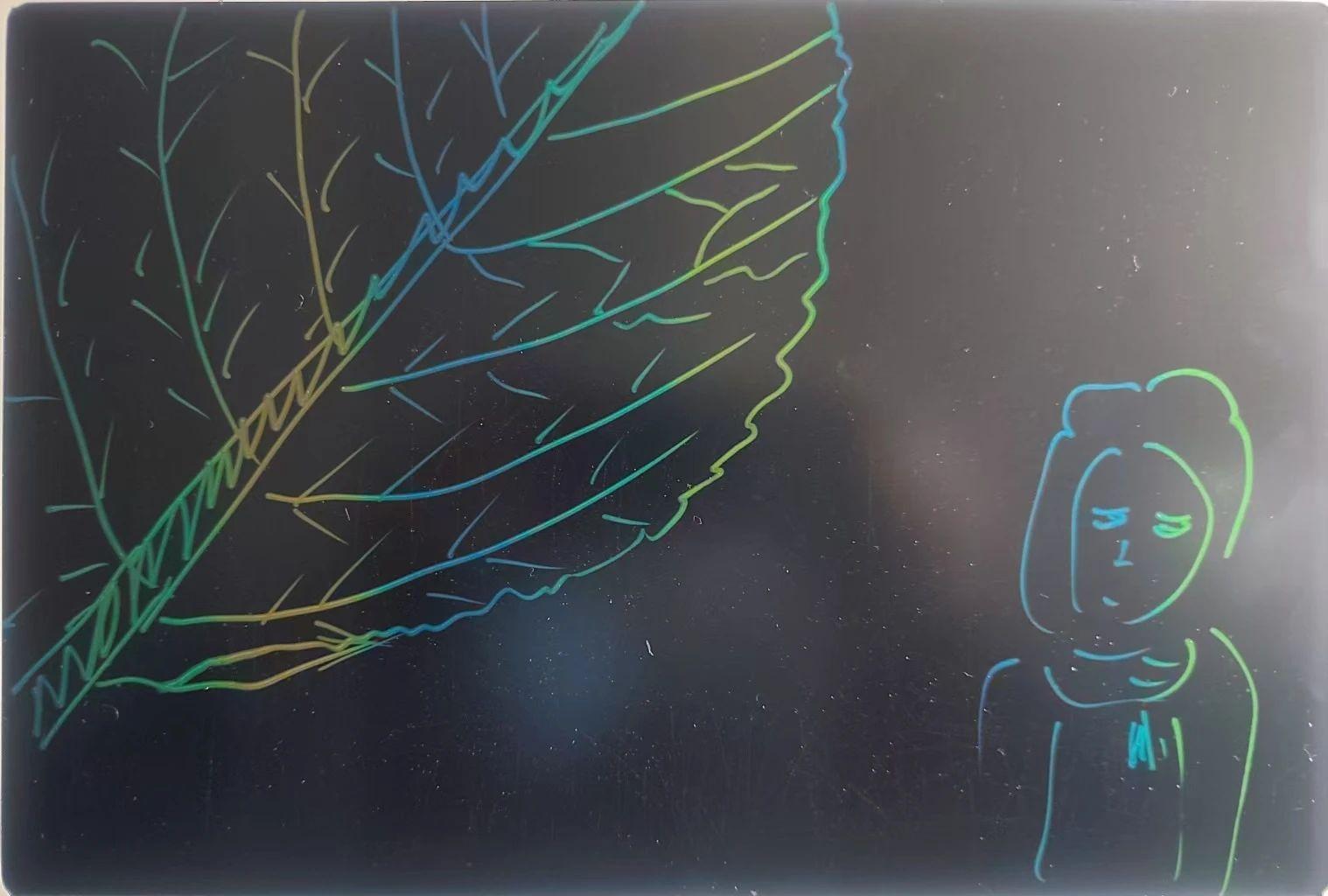 这幅作品呈现了一片叶子的轮廓和一个简单的人物形象。叶子以彩虹色的线条勾勒,展现出自然的细腻与多样性。人物则以简约的线条表现,面无表情,似乎在思考或沉思。整体色调柔和,背景为深色,使得线条更加突出,给人一种宁静与内省的感觉。作品可能在探讨人与自然的关系,或是表达一种内心的静谧与反思。