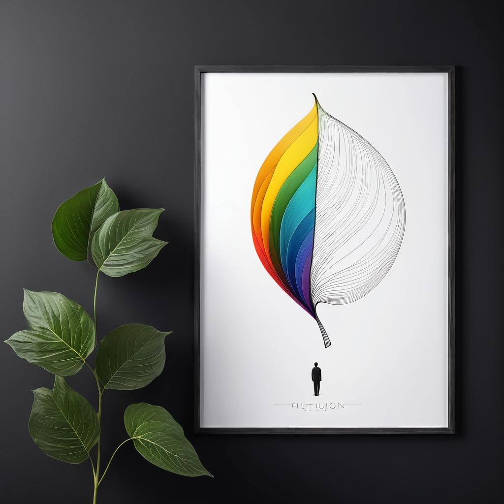 在这幅作品中,艺术家通过极简主义的手法,展现了自然与人类的微妙关系。叶子的细致纹理与人物的简约线条形成鲜明对比,这不仅是视觉上的冲击,更是一种情感上的共鸣。叶子以彩虹色的线条勾勒,象征着自然的多样性与生命力,而人物的轮廓则显得简单而内敛,仿佛在思考自然给予的启示。这种对比反映了人类在自然面前的谦逊与思考,激发观者对于自然与自我关系的反思。通过这种简单的表达方式,艺术家成功地传达了一种内心的宁静与对自然的敬畏。同时,作品也在提示我们,在这个快节奏的世界中,停下来,欣赏自然的美丽与复杂,从而找到内心的平和。建议在未来的创作中,可以通过增加背景中的自然元素,比如微风吹动的树叶,或是细微的光影变化,来增强作品的深度与情感表达,进一步引导观者进入一种沉思的状态。