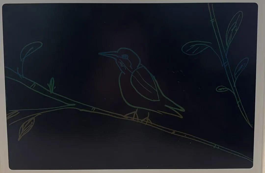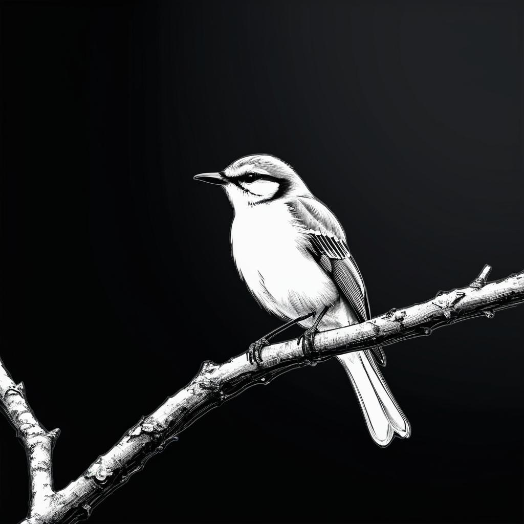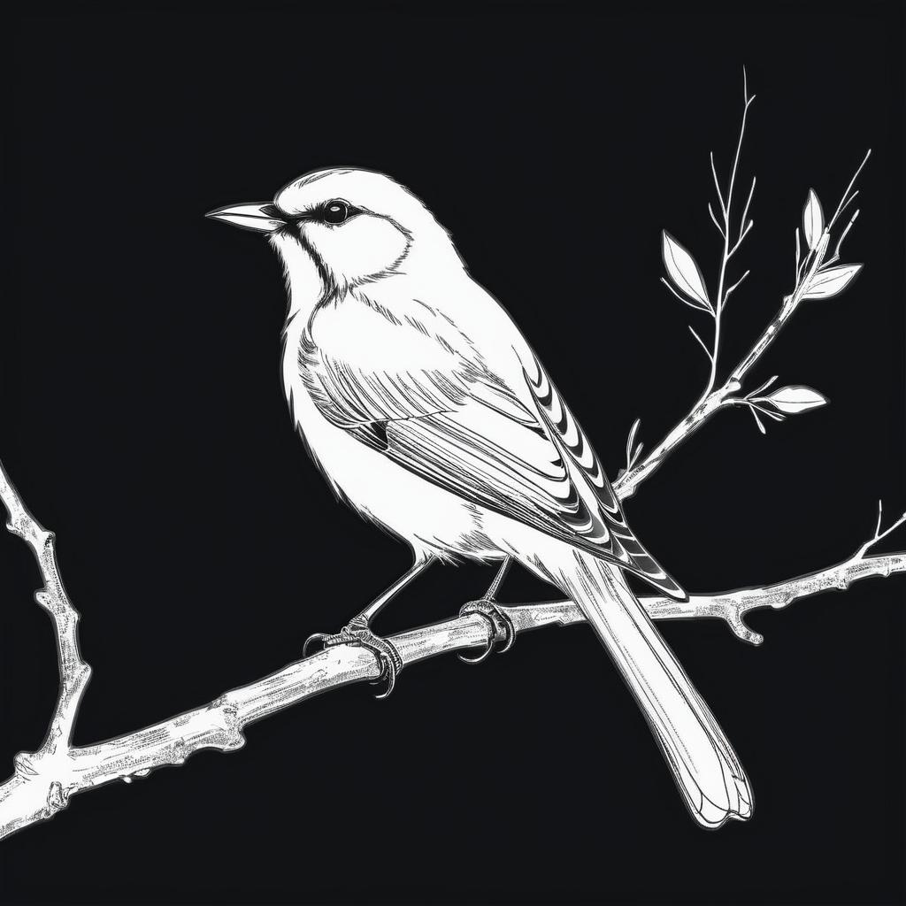 这幅作品展示了一只鸟栖息在树枝上的线条画。背景是深色的,鸟和树枝的轮廓用简单的线条勾勒出来,呈现出一种简约而宁静的氛围。这种风格强调了自然的宁静与和谐,可能意在传达一种平和和宁静的情感。
