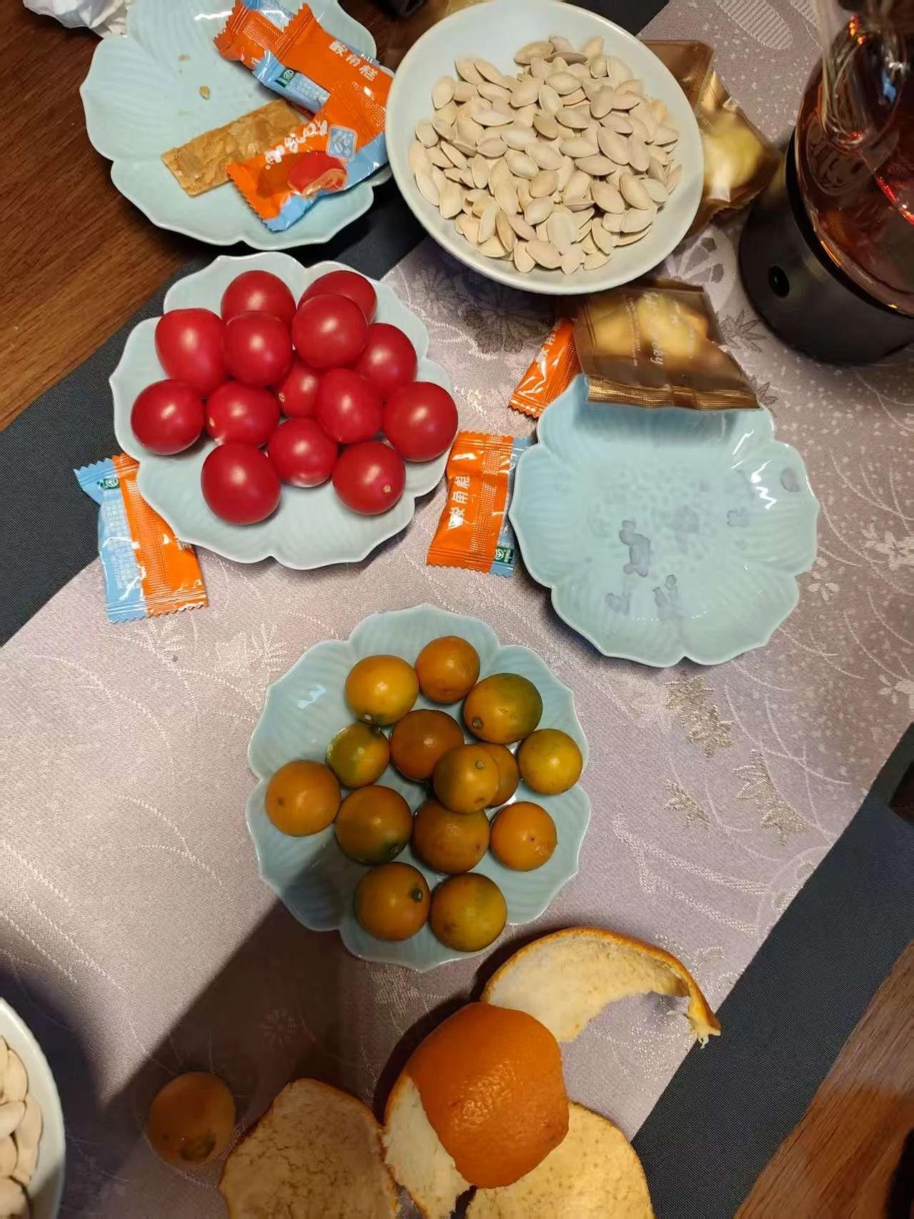这张照片呈现了一组色彩鲜艳的果盘,包含西红柿、橙子和瓜子等元素。色彩搭配上,红色和橙色的鲜明对比,以及蓝色盘子的柔和底色,营造出一种温馨且愉悦的氛围。光影效果微妙,增强了食物的质感。整体构图平衡,食物的排列方式自然且富有生活气息,暗示着一种闲适的日常场景。这种场景的简单和色彩的丰富,传递出一种家庭聚会或休闲时光的温暖情感。