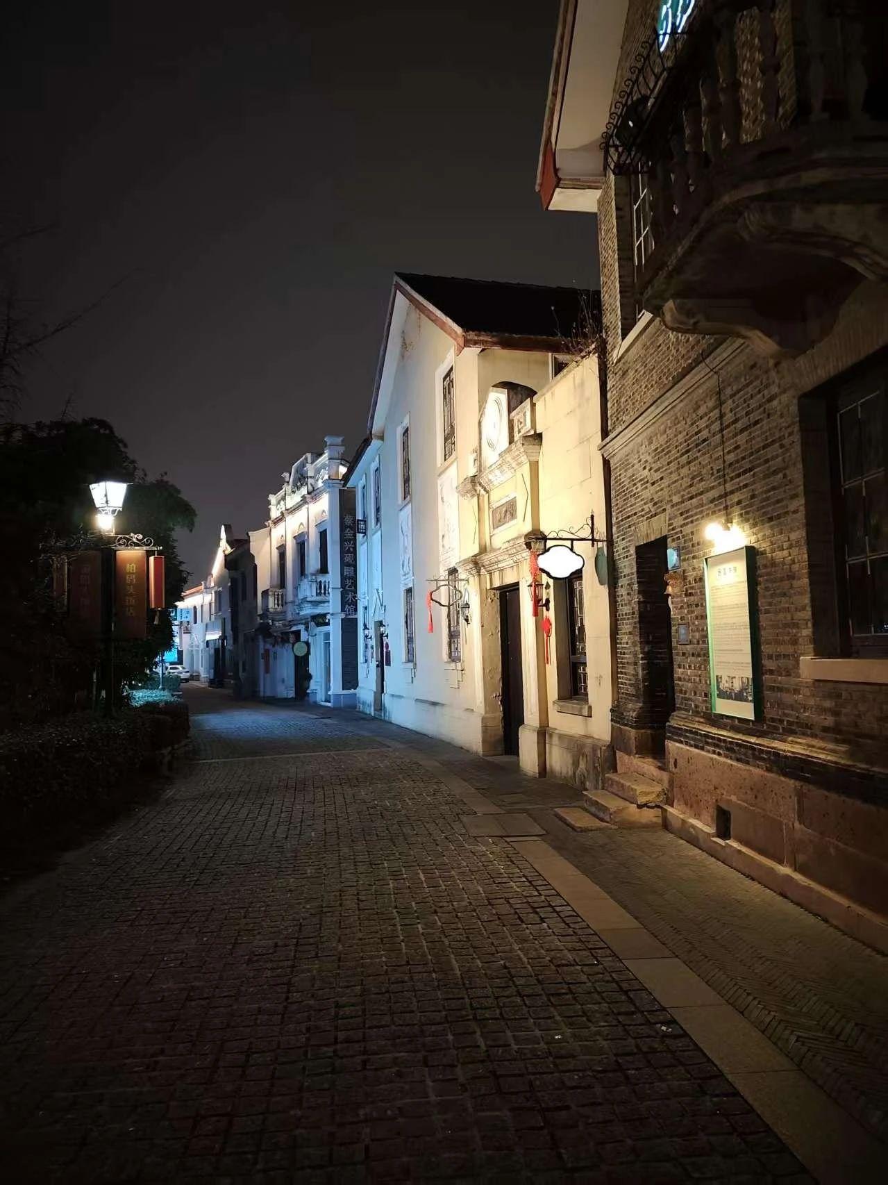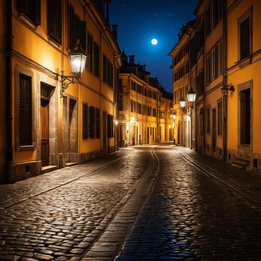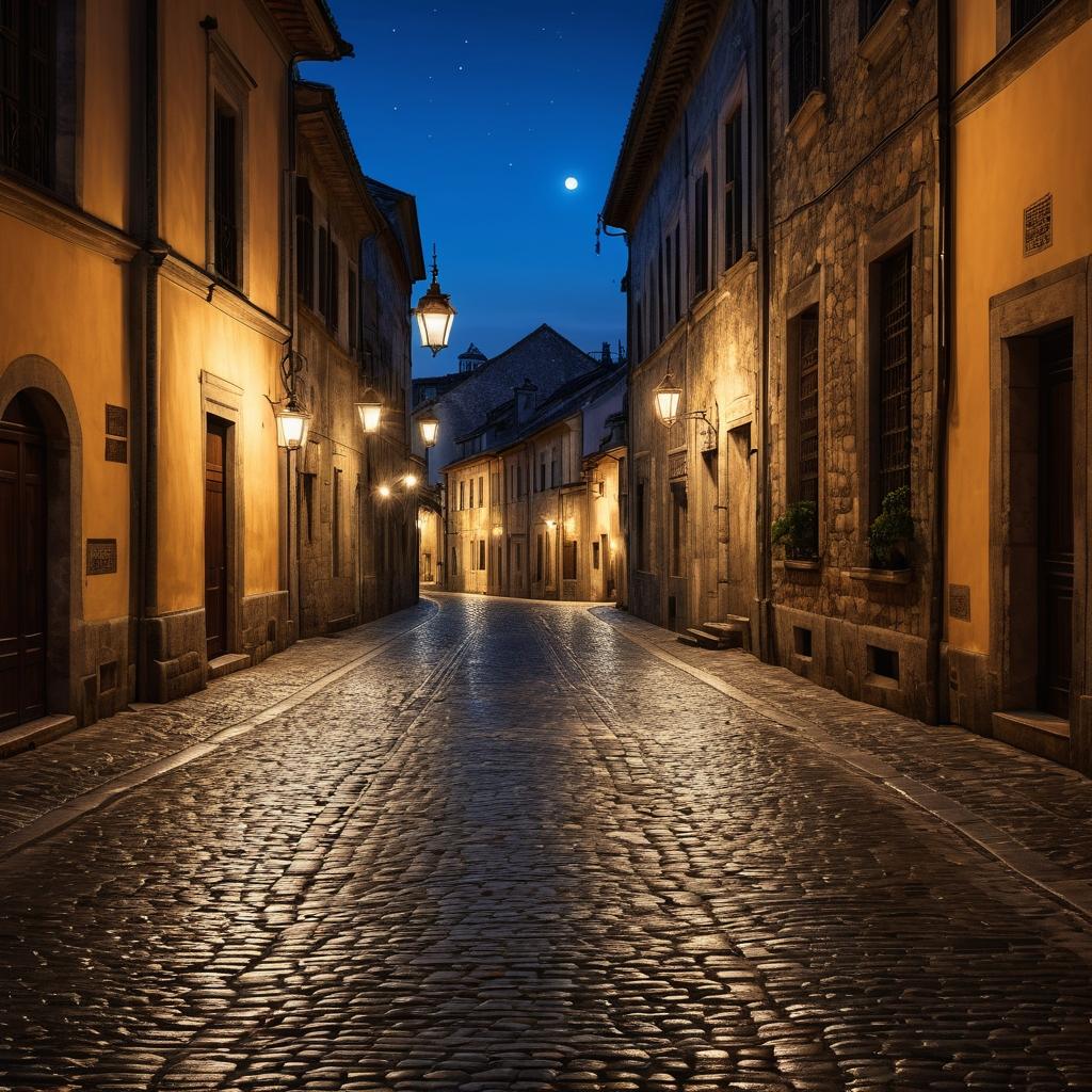 这幅夜景照片展现了一条安静的古镇街道。温暖的灯光洒在石板路上,建筑物的墙壁在灯光的照射下呈现出柔和的阴影。整幅画面透出一种宁静而怀旧的情感,可能传达了对历史与传统的尊重与怀念。