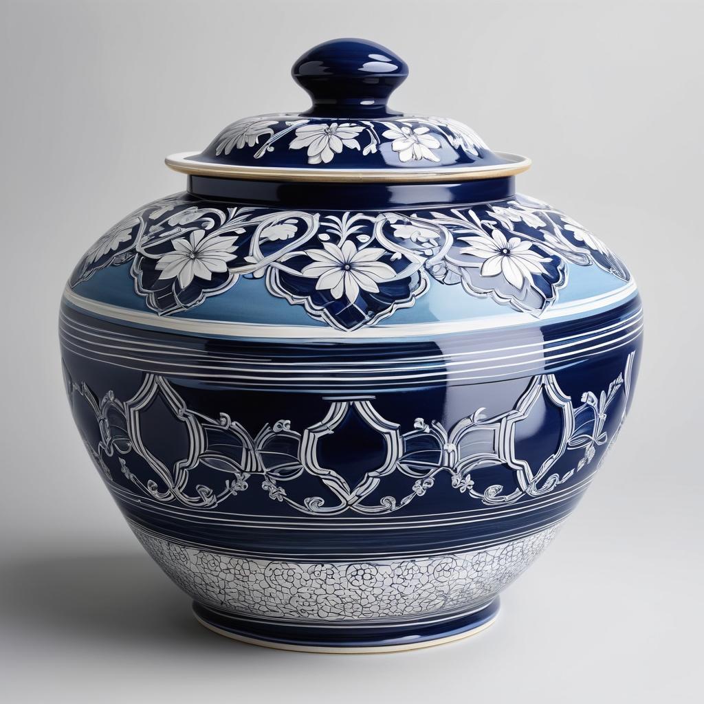 这幅作品展示了一件精美的陶瓷罐,罐身和盖子上有着复杂的花卉图案装饰。深蓝色的底色与白色的花纹形成鲜明对比,盖子上的同心圆纹理增加了作品的层次感。整体设计传达了一种古典且优雅的美感,可能意在表现传统工艺的精湛和历史的厚重感。