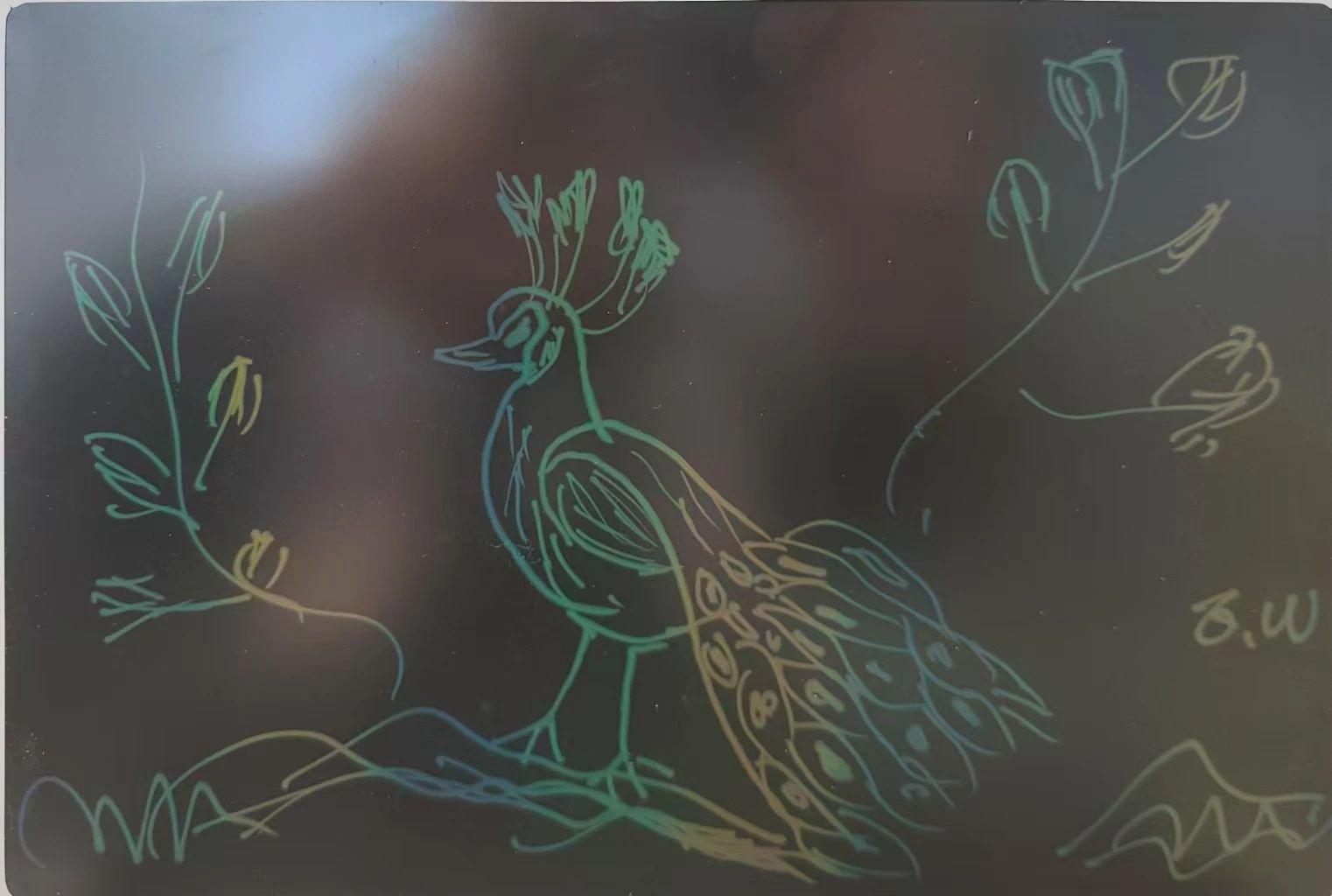 这幅作品运用简单的线条勾勒出一只孔雀,背景中有几枝植物。孔雀的羽毛用渐变色表现,增加了艺术感。整体画面简洁而富有装饰性,展现了自然的宁静与优雅。创作者可能希望通过这种风格传达对自然之美的欣赏。