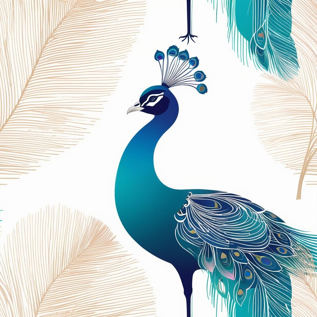 这幅作品以简约的线条勾勒出一个宁静而优雅的自然场景,主体是一只孔雀,象征着高贵和美丽。简练的线条和柔和的渐变色彩不仅展现了孔雀的优雅,也为整幅作品增添了装饰性和艺术感。创作者通过这种方式,可能希望表达对自然之美的感知和赞美。