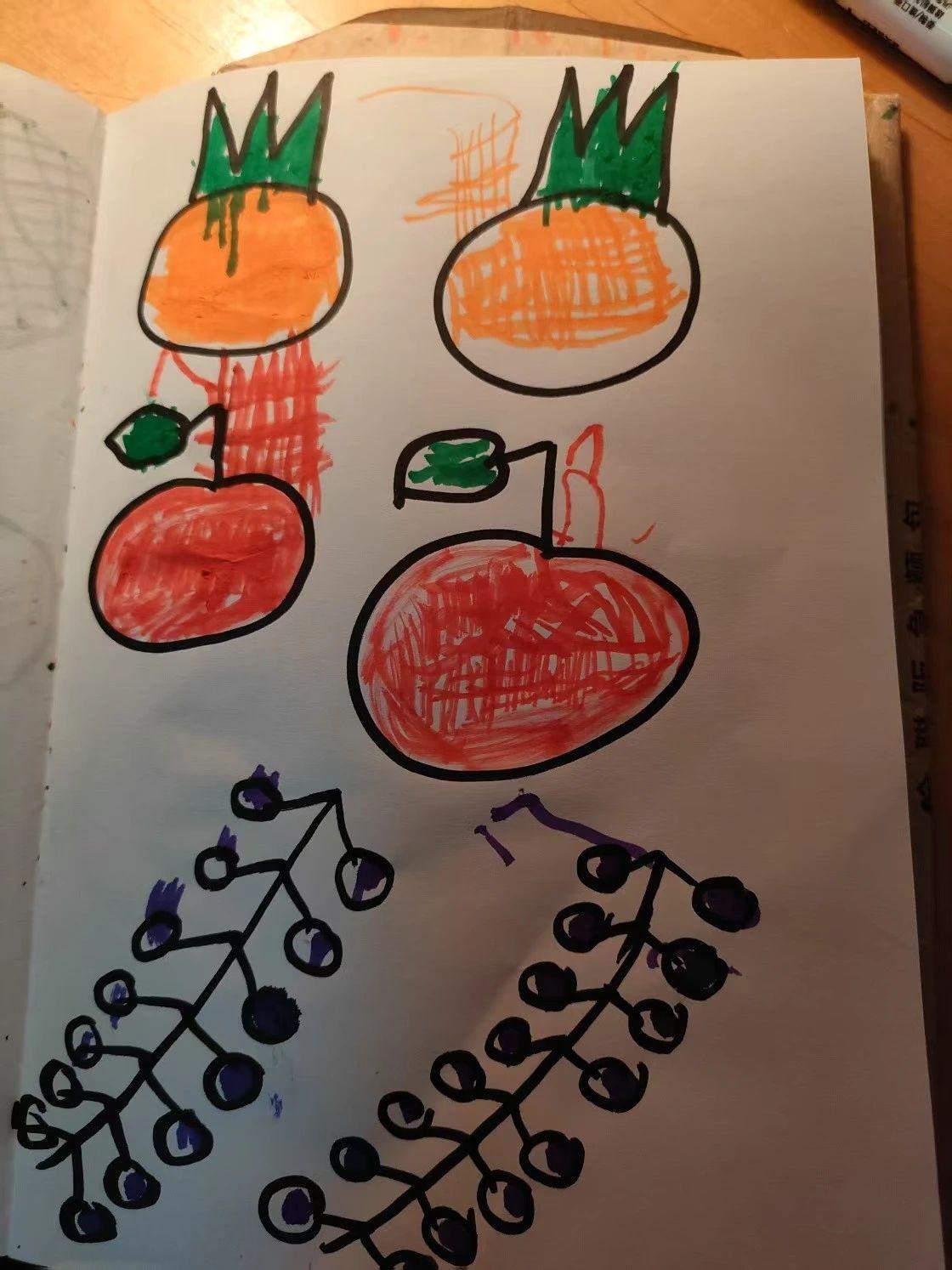 在这幅充满童趣的作品中,我们看到了简单而大胆的色彩运用,对于儿童艺术来说,这是一种常见的表现方式。作品中的主要元素是橙色和红色的果实,以及顶部的绿色叶子,这种色彩组合自然且富有生命力。下方的紫色圆形结构可能代表浆果,为画面增添了更多的趣味性。