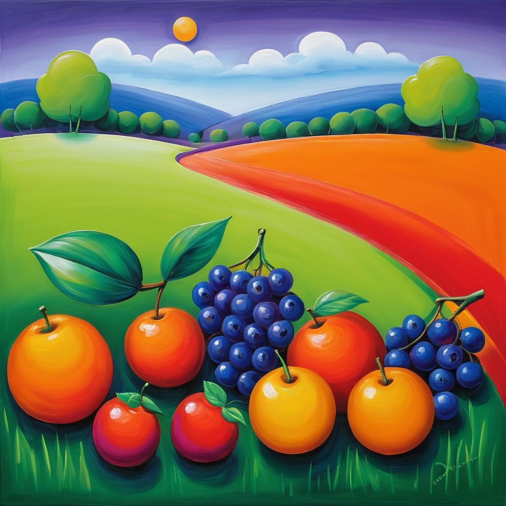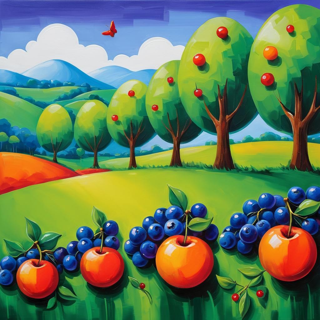 这幅画通过鲜明的色彩和简单的形状,展现了一种原始而纯粹的艺术风格,常见于儿童艺术创作。为了提升这幅作品,可以考虑在背景中加入更多自然元素,如蓝天或草地,以增强画面的深度。此外,可以运用不同的色调和渐变来丰富果实和叶子的表现,增加画面的立体感。通过这些调整,作品将更具表现力和艺术吸引力,同时仍保留其天真和直率的本质。