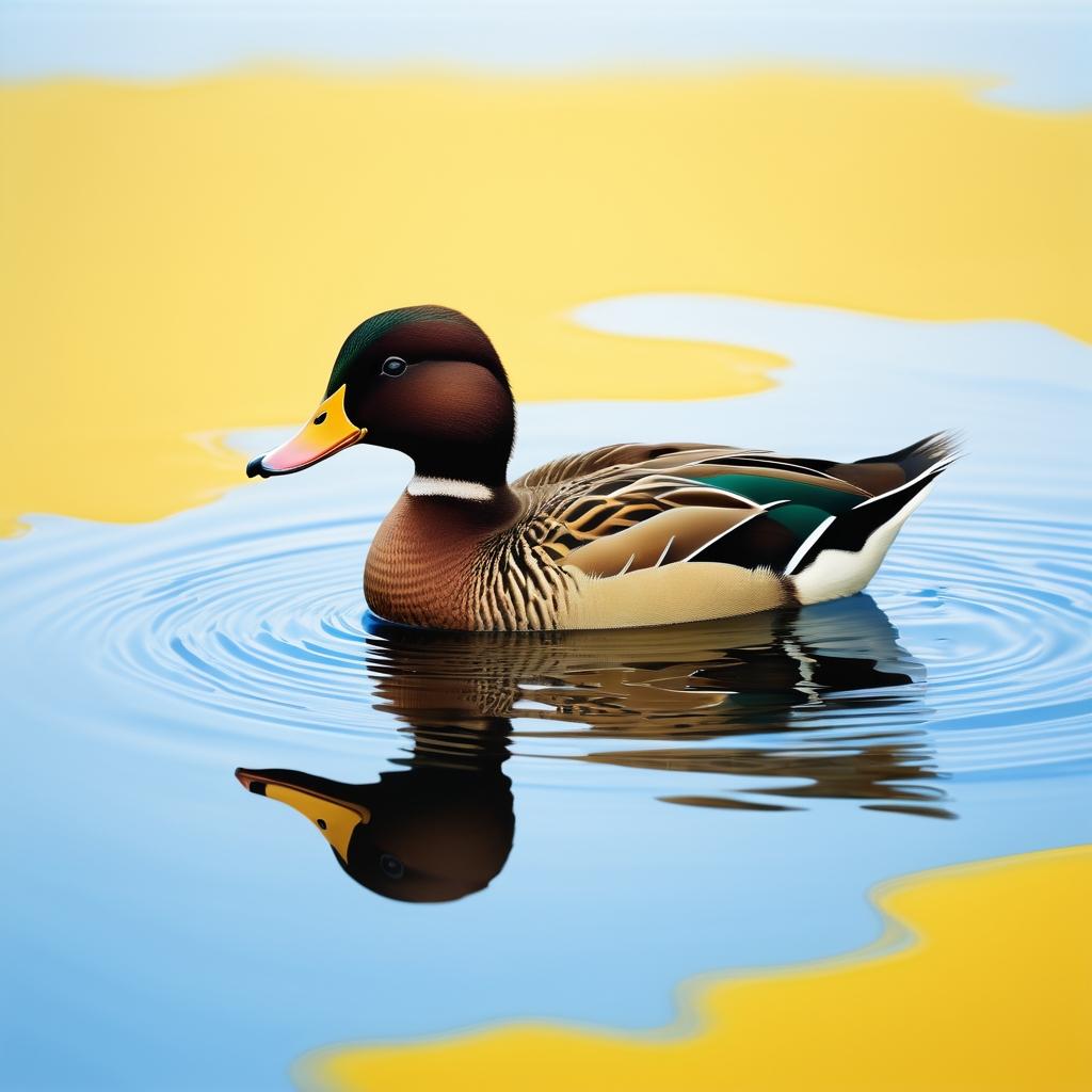 这幅画作以简洁的色块和形状传达出一种纯真和直接的美感。黄色背景和棕色主体形成了鲜明的对比,使画面显得活泼且具有视觉冲击力。为了提升这幅作品,可以考虑在背景中加入更多的细节,如轻柔的蓝色波纹,模拟水面,使鸭子看起来像在水中漂浮。此外,可以在鸭子的周围添加一些小的自然元素,比如树叶或小鱼,以丰富画面的层次和故事性。这样的细节不仅能够增加作品的深度,还能增强观者的情感共鸣,使其更加生动和吸引人。