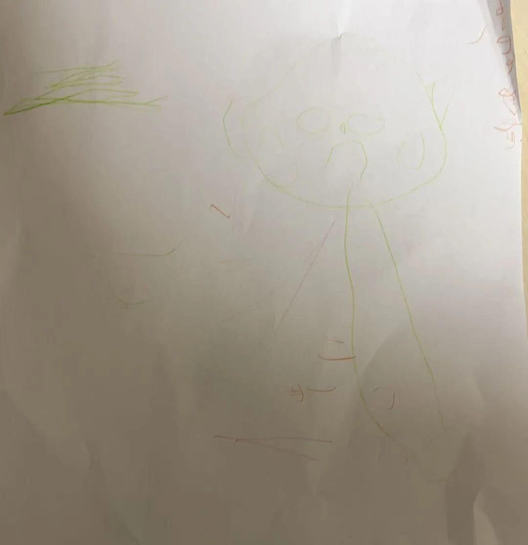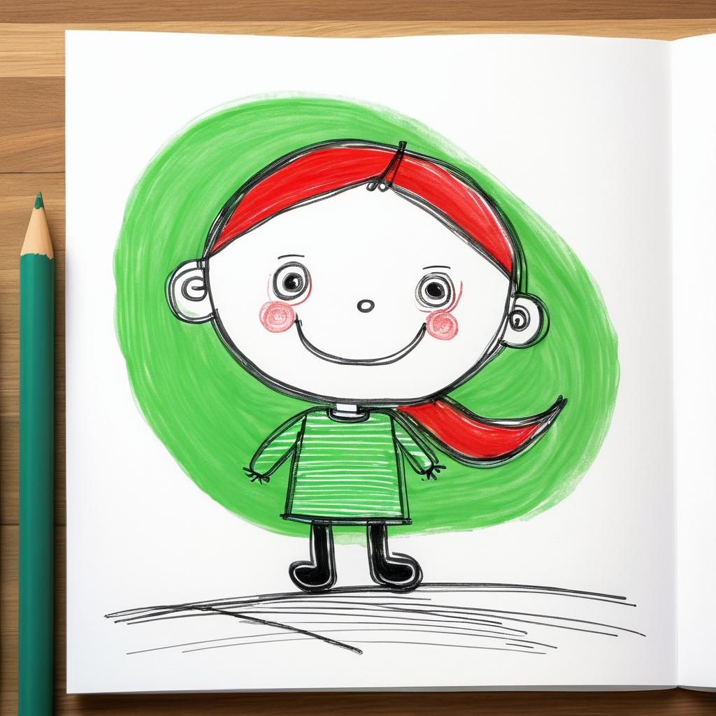 这幅图片展示了一张简单的儿童涂鸦,主要采用了淡绿色和红色的线条。图中可能描绘了一个头部和身体的形象,线条稀疏且富有孩童的天真。整体构图松散,情感表达纯真而随意,可能传达了儿童的想象力和创造力。