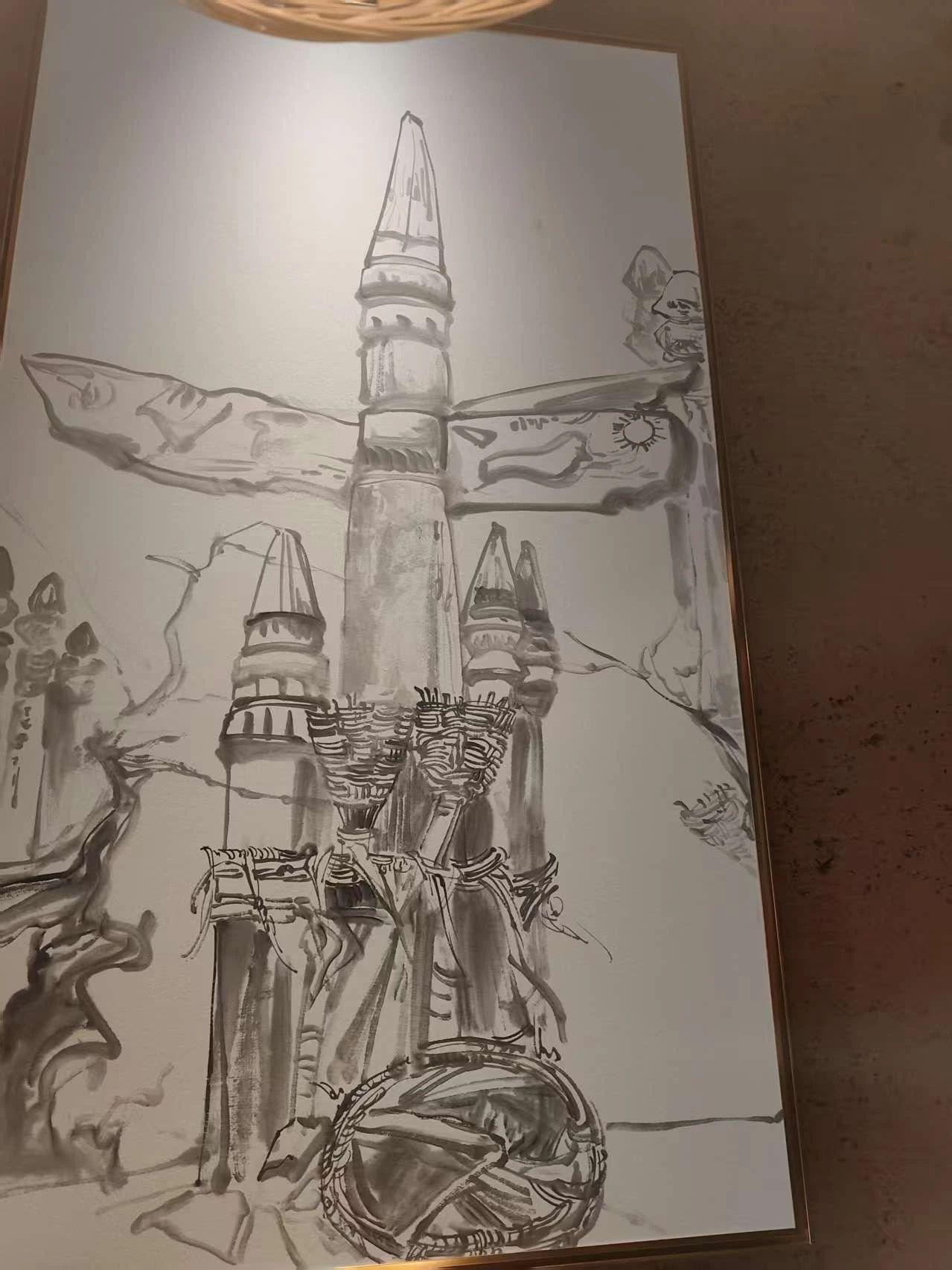 这幅作品以黑白水墨的形式表现了图腾柱,给人一种古老神秘的感觉。通过夸张的线条和细致的纹理表现,画面传达出一种力量与神秘的结合,仿佛在讲述一个古老的传说。可以考虑在未来的创作中加入一些现代的元素,比如用更丰富的色彩或数字化的手法,来让古老文化与当代艺术对话。同时,可以通过加入一些背景元素,如自然景观或者人类活动,来增加故事性和深度,使作品不仅表达图腾的神秘,更传达出其在历史长河中的重要地位和影响。