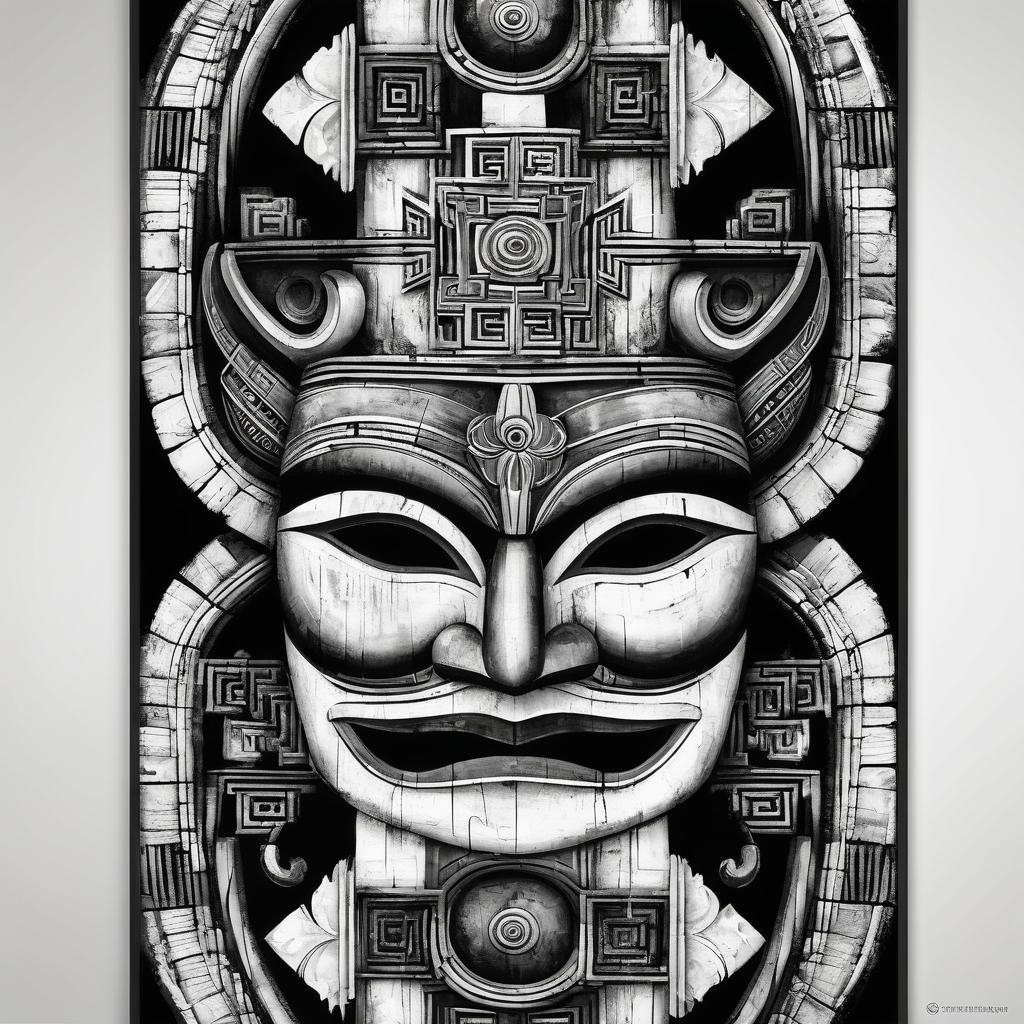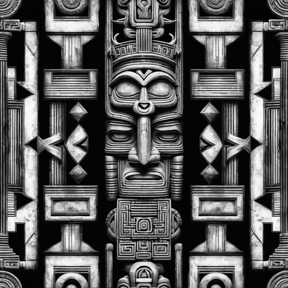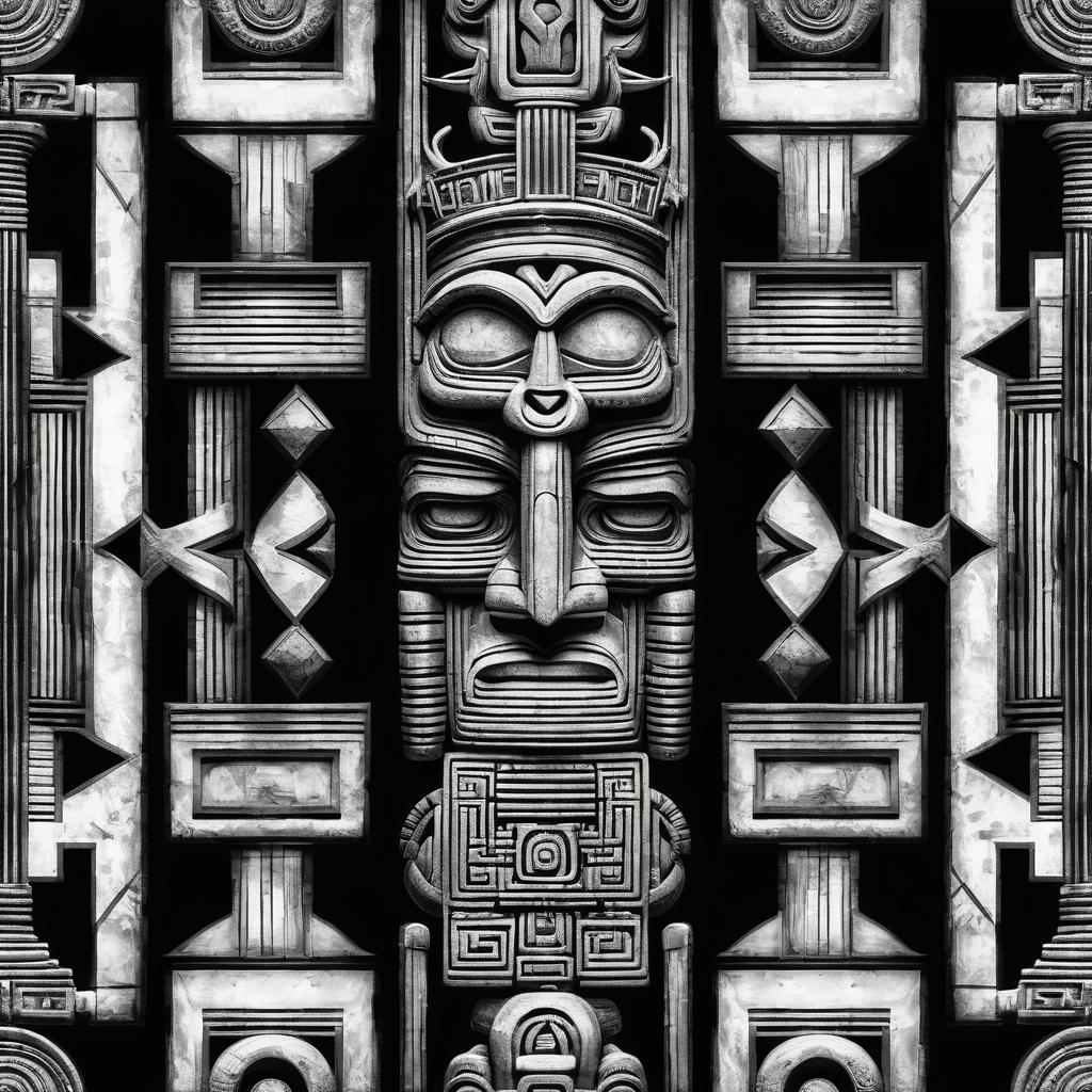 这幅作品中主要元素是几个立柱形状的图腾雕刻,具有原始和神秘的氛围。整体采用黑白色调,突显出线条的力度和纹理细节。构图上,图腾矗立于画面中央,给人一种庄重和神秘的感觉。可能传达的主题是对古老文化和传统的敬畏,以及自然力量的崇拜。