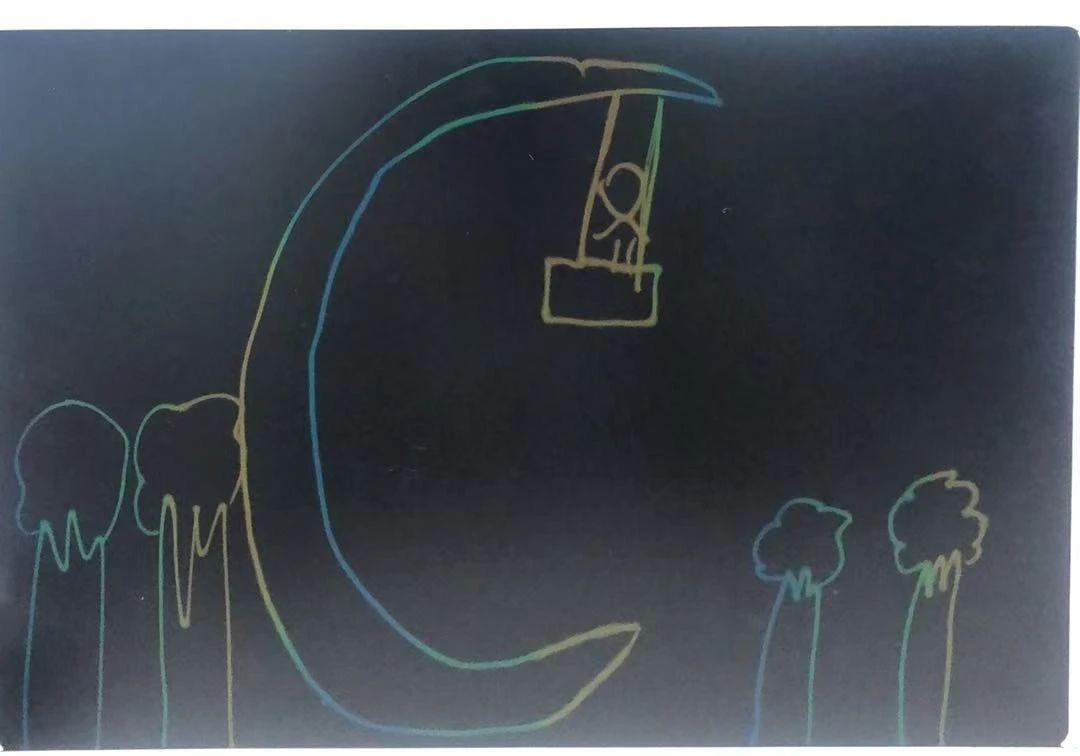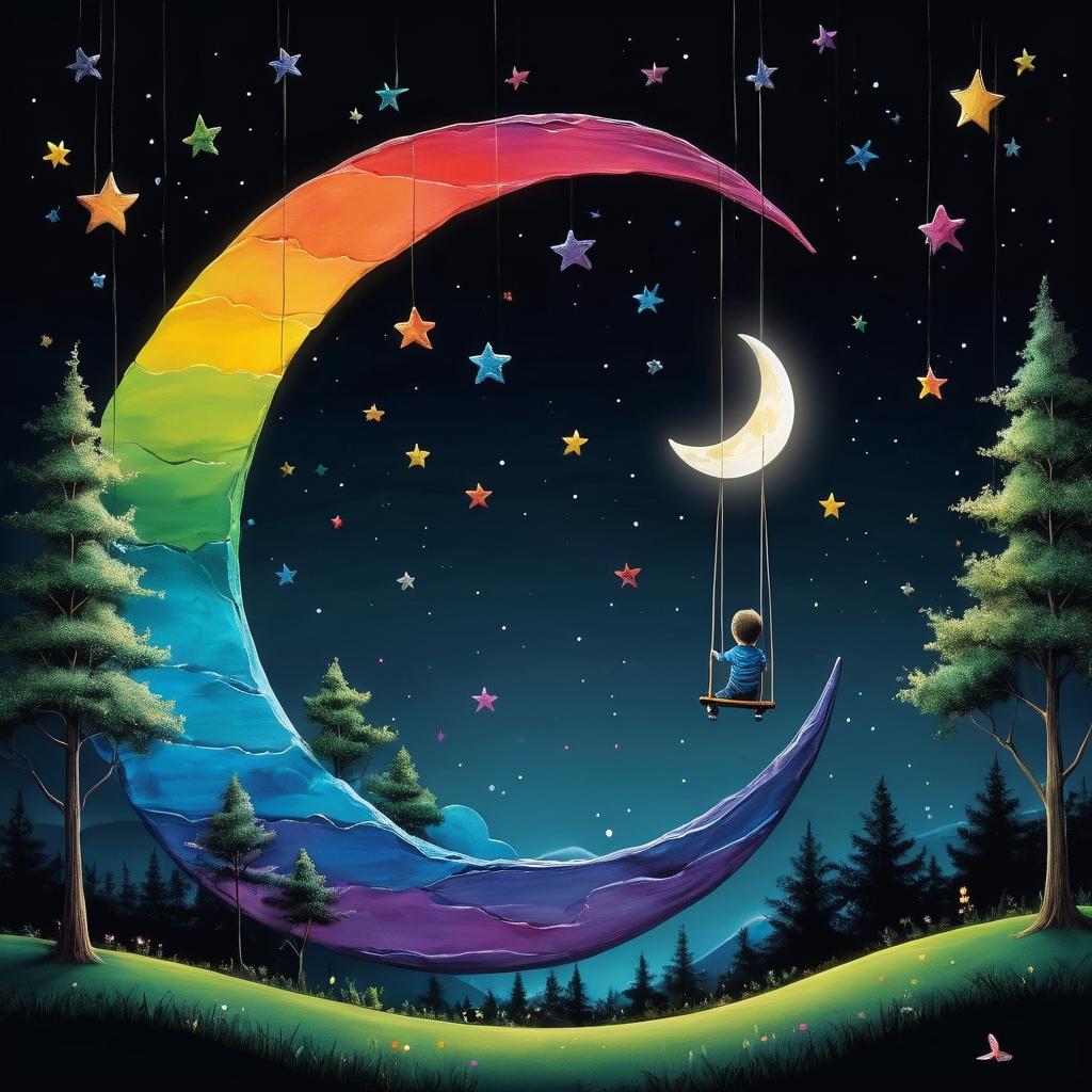 这幅作品以黑色为背景,呈现出一种夜晚的神秘氛围。画面中主要元素包括一个巨大的弯月和一个坐在秋千上的小人,秋千悬挂在月亮上。地面上还描绘了几棵简单的树。线条使用了彩虹色,增添了一种梦幻的感觉。整体构图简单但富有童趣,可能在传达一种关于梦境或幻想的主题。