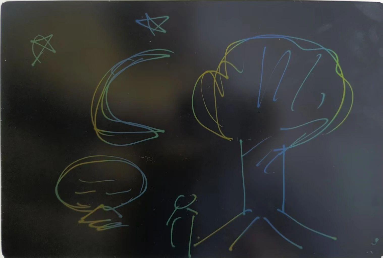 这幅作品使用了简单的线条和多彩的颜色绘制了一个夜空场景,包含了星星、月亮、一棵树和一个小人物。整个画面给人一种童趣和幻想的感觉,似乎在表达宁静的夜晚和自然的和谐。
