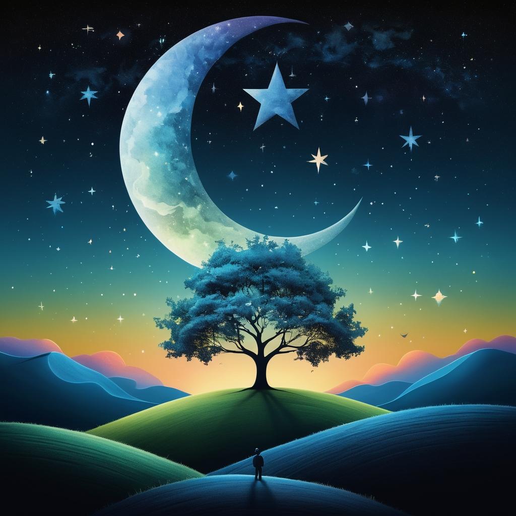 这幅作品以其简洁而富有童趣的表达方式,呈现了一个宁静而梦幻的夜晚场景。通过简单的线条和多彩的颜色,创作者成功地唤起了观众对夜空的想象。月亮和星星的组合,以及树下的小人物,仿佛在讲述一个关于夜晚的童话故事。这种创作风格让人联想到超现实主义艺术家Joan Miró,他常以简洁的线条和鲜艳的色彩来表达复杂的情感与幻想。在提升这类作品时,可以考虑增加背景细节,比如云朵和远山,以丰富视觉层次。同时,利用色彩渐变表现夜空的深邃和光影效果,增强作品的立体感。通过这些手法,观众不仅能欣赏到一个简单的画面,还能感受到自然与幻想交织的美妙。