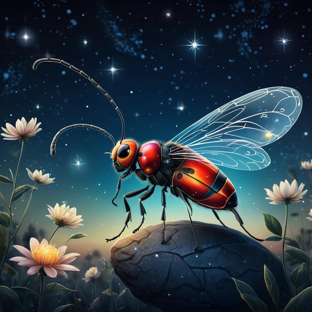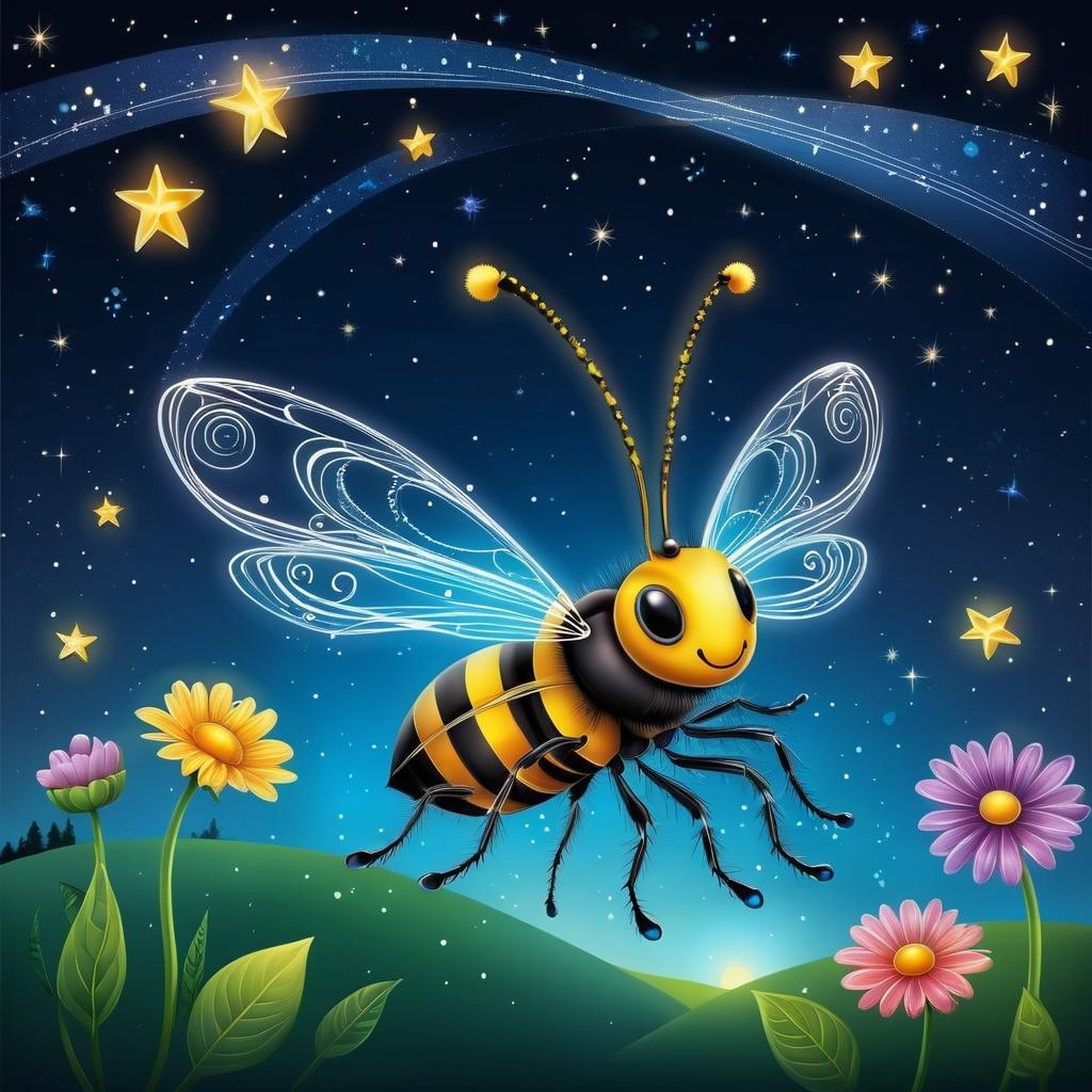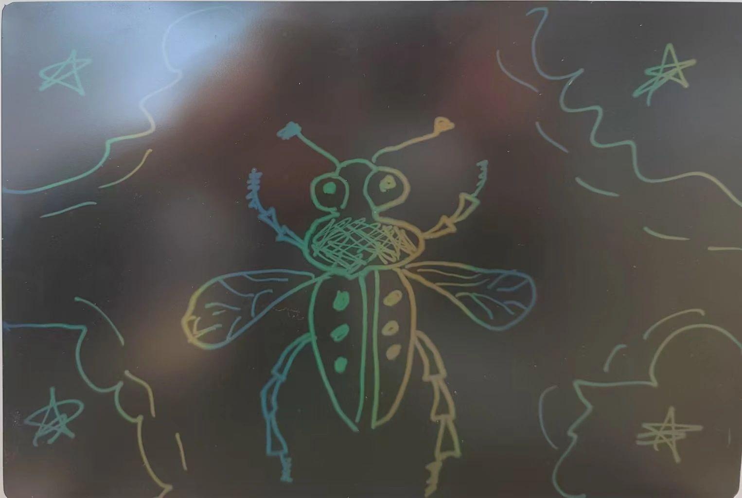 这幅作品以简单的线条和形状传达了一种童趣和幻想。这种风格的作品可以通过增加背景的细节以及丰富色彩层次来提升。可以考虑将昆虫与背景中的星星和线条进行更紧密的联系,创造一种更具梦幻色彩的场景。例如,增加一些发光的效果,使星星与昆虫之间有互动,仿佛昆虫在一片神秘的夜空中翩翩起舞。此外,可以尝试引入更多的自然元素,如花朵或叶子,来丰富画面的层次感。