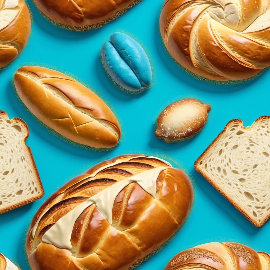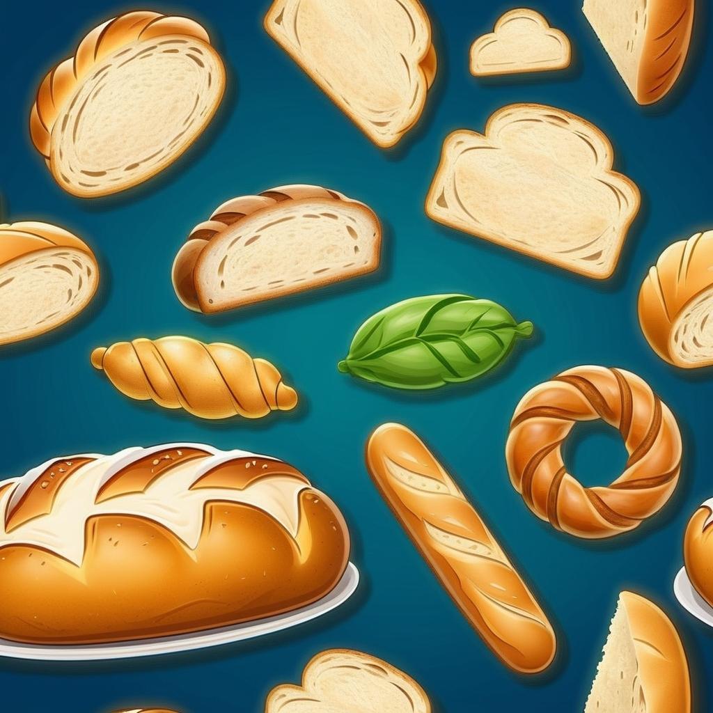 这幅图展示了一些简单的面包轮廓图,使用了多种颜色如绿色、蓝色和黄色。面包的形状包括法棍、圆面包、羊角面包等,图案简单且平面化,暗示了一种轻松和休闲的氛围。