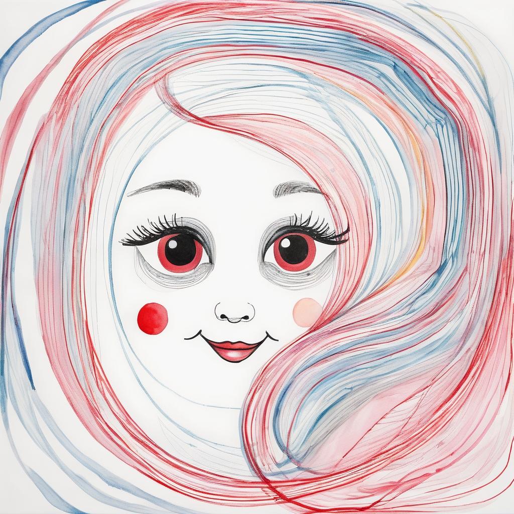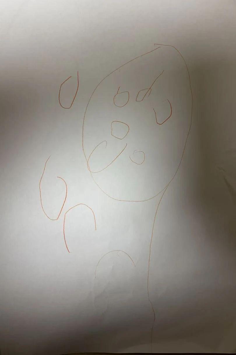 这幅作品呈现了简单的线条和形状,可能是儿童的涂鸦作品。线条主要是红色,构成了一个可能的人脸或其他形象。画面整体简洁,给人一种天真和纯粹的感觉。
