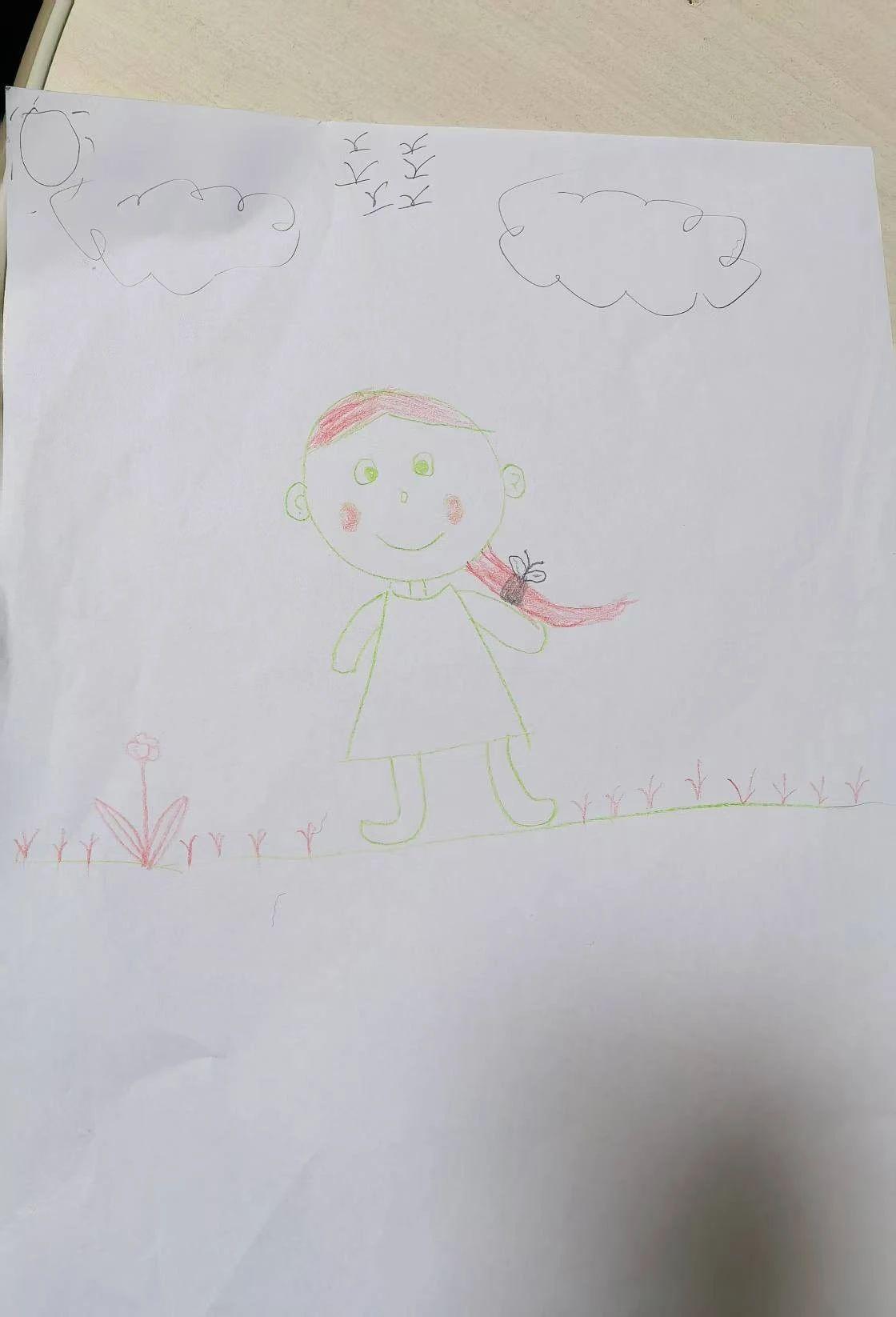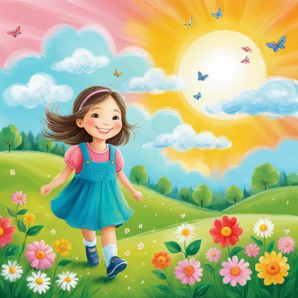 这幅作品表现出一种简单而纯粹的儿童绘画风格,使用了温和的色彩和基本的形状。主要元素包括一个微笑的小女孩,周围有云朵和太阳,以及简单的草地和花朵。画作传达了一种快乐、无忧无虑的氛围,可能体现了儿童对自然世界的欣赏和好奇。