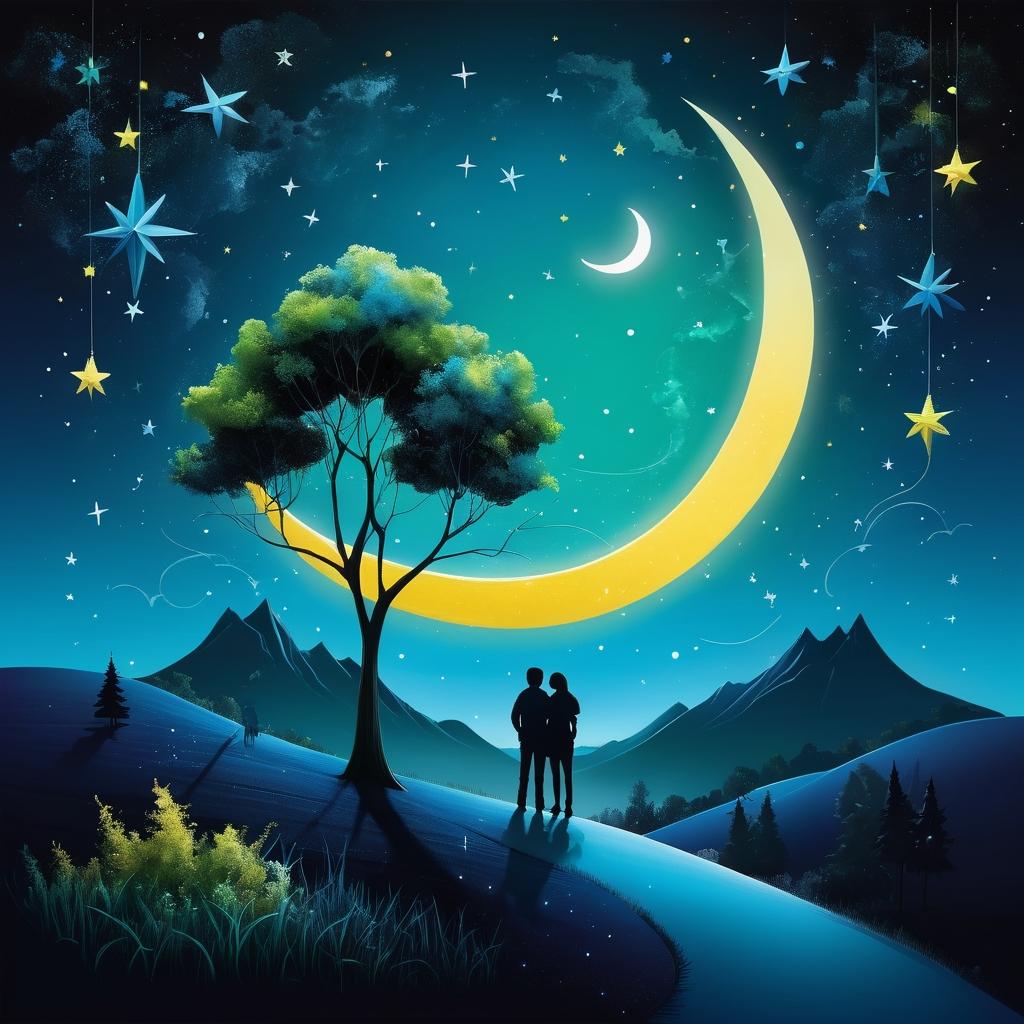 这幅作品使用简单的线条和色彩描绘了一个夜空的场景。主要元素包括一轮弯月、几颗星星、一个抽象的树形和两个简化的人物。色彩上使用了蓝色、绿色和黄色,在黑色背景上形成鲜明的对比,带来一种童趣和梦幻的感觉。画面传达了一种宁静、神秘和充满想象的氛围,可能意在表达亲子之间的温馨时光和对自然的敬畏。