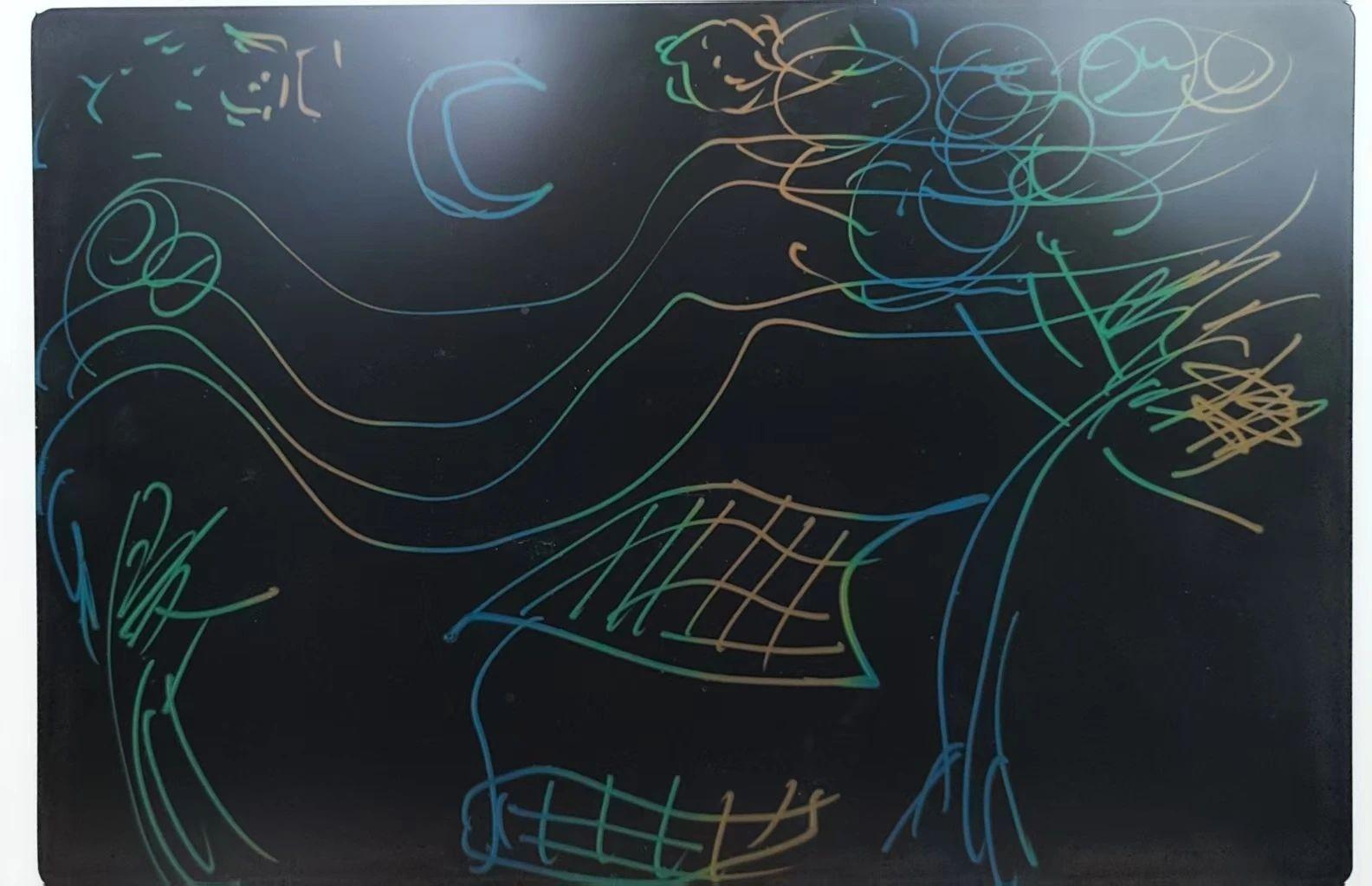 这幅作品充满了流动的线条和色彩,背景是深色的画板,线条以蓝色、绿色和橙色为主。主要元素包括一个弯曲的月亮形状和一棵树的轮廓,伴随着一些流动的线条,可能代表风或者是河流。这些元素似乎在表达一种自然的动态和和谐。整体构图具有一种自发性和自由感,可能传达一种夜晚的宁静与神秘。