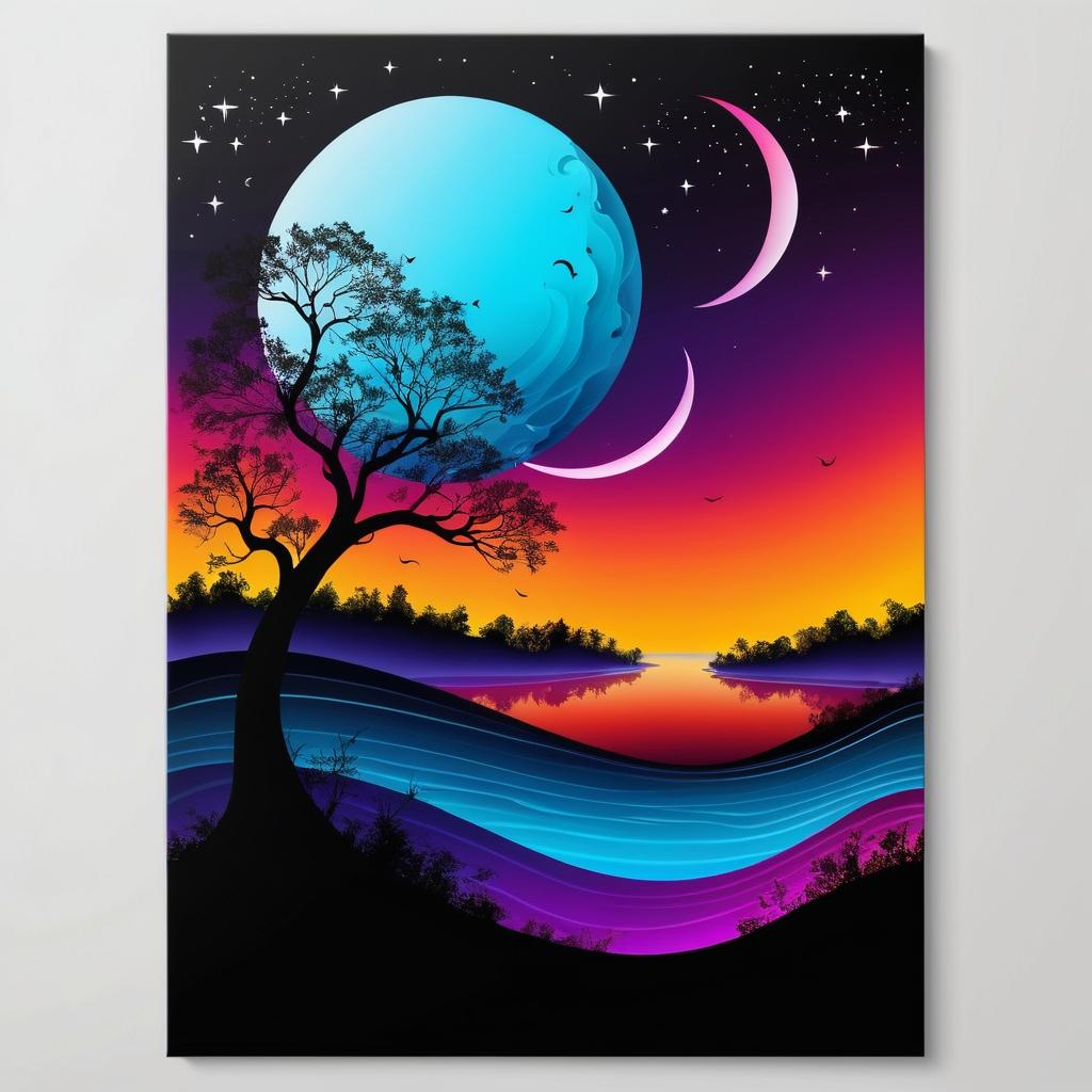 这幅作品以其独特的线条和色彩组合,为我们展现了一幅充满童趣和幻想的夜景图。画面中,简单的弯曲线条和色彩的运用,构成了一个充满动态的自然景观。弯曲的月亮形状和流动的线条,仿佛在微风中摇曳的树木,传递出一种自然的宁静与和谐。这种艺术风格让人不禁联想到Joan Miró的超现实主义,尽管线条简单,却充满了想象力和创造力。通过增加更多的细节和色彩过渡,这幅作品可以被升华为一个更加深邃和富有情感的艺术作品。想象一下,在深色的背景上,加入更多的星星和云朵,树木的纹理更加细腻,以及色彩渐变更加丰富的画面,这将如何增强整体的视觉冲击力和情感深度。这样一幅作品,不仅保留了原有的童趣,还能在观者心中激起更多的共鸣和遐想。