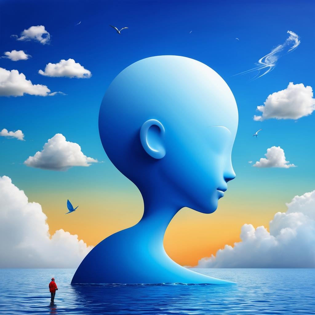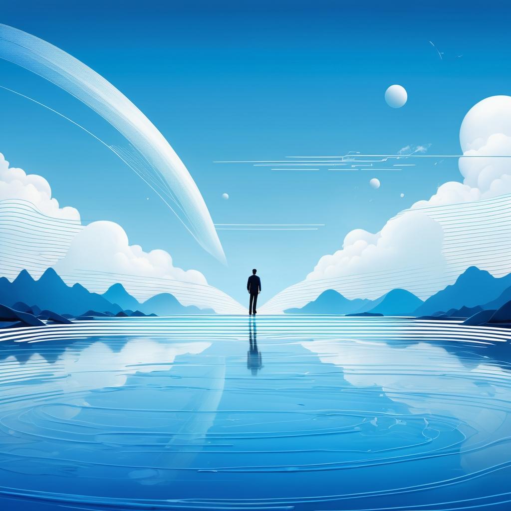这幅作品以简单的线条和有限的色彩呈现,主要由蓝色和略带阴影的灰色构成。图中呈现出一个简单的人物形象,似乎站在一个不规则的形状上方,给人一种动态的感觉。整体构图简洁,可能传达了一种自由与探索的主题。