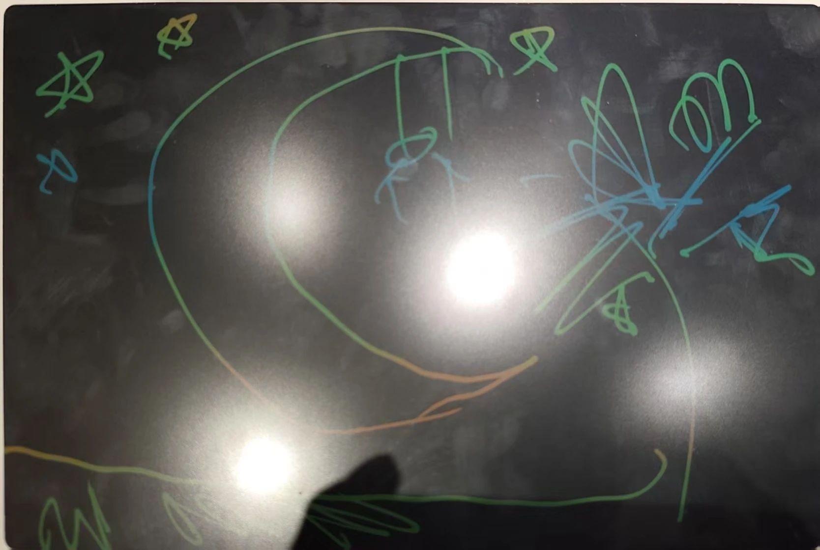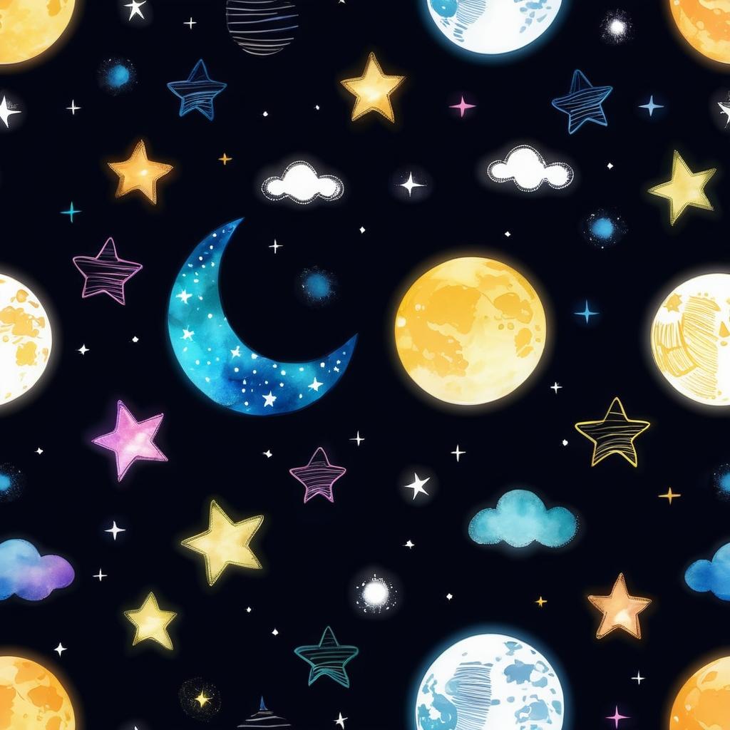 这幅作品中主要元素包括用简单线条勾勒出的星星和月亮,采用了多种颜色,背景是黑色。构图简单但富有童趣,表达了一种天真无邪的情感。创作者可能意在表现一个梦幻的夜空场景。