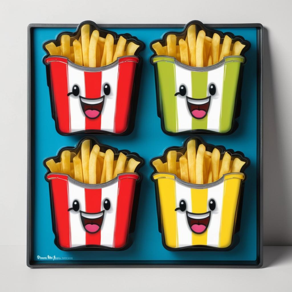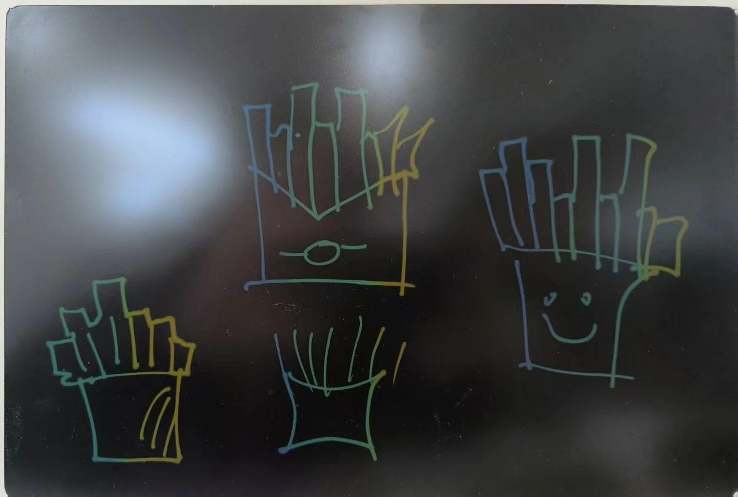 这幅作品展示了四个用简单线条绘制的薯条盒子形象。每个盒子都有不同的设计元素,如笑脸或独特的线条装饰。背景是深色的,这使得线条颜色更加突出,形成了一种对比鲜明的视觉效果。作品传达了一种轻松和幽默的情感。