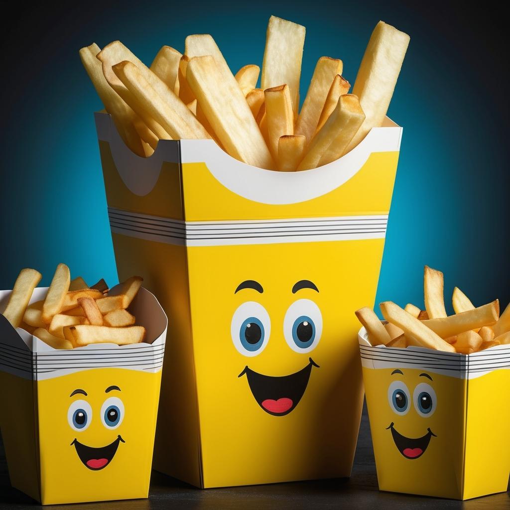 这幅作品以简单而富有童趣的方式描绘了薯条盒子,利用色彩和线条的对比来传达一种乐观和快乐的情感。为了提升这幅作品,可以考虑增加背景元素,例如加入一些相关的食物或场景,形成一个更完整的故事情境。此外,通过增加细节,如盒子上的图案或颜色过渡,可以使图像更加丰富和吸引人。将这些薯条盒子放置在一个互动的场景中,如一起参加派对或在游乐场,可以进一步增强作品的趣味性和叙事性。