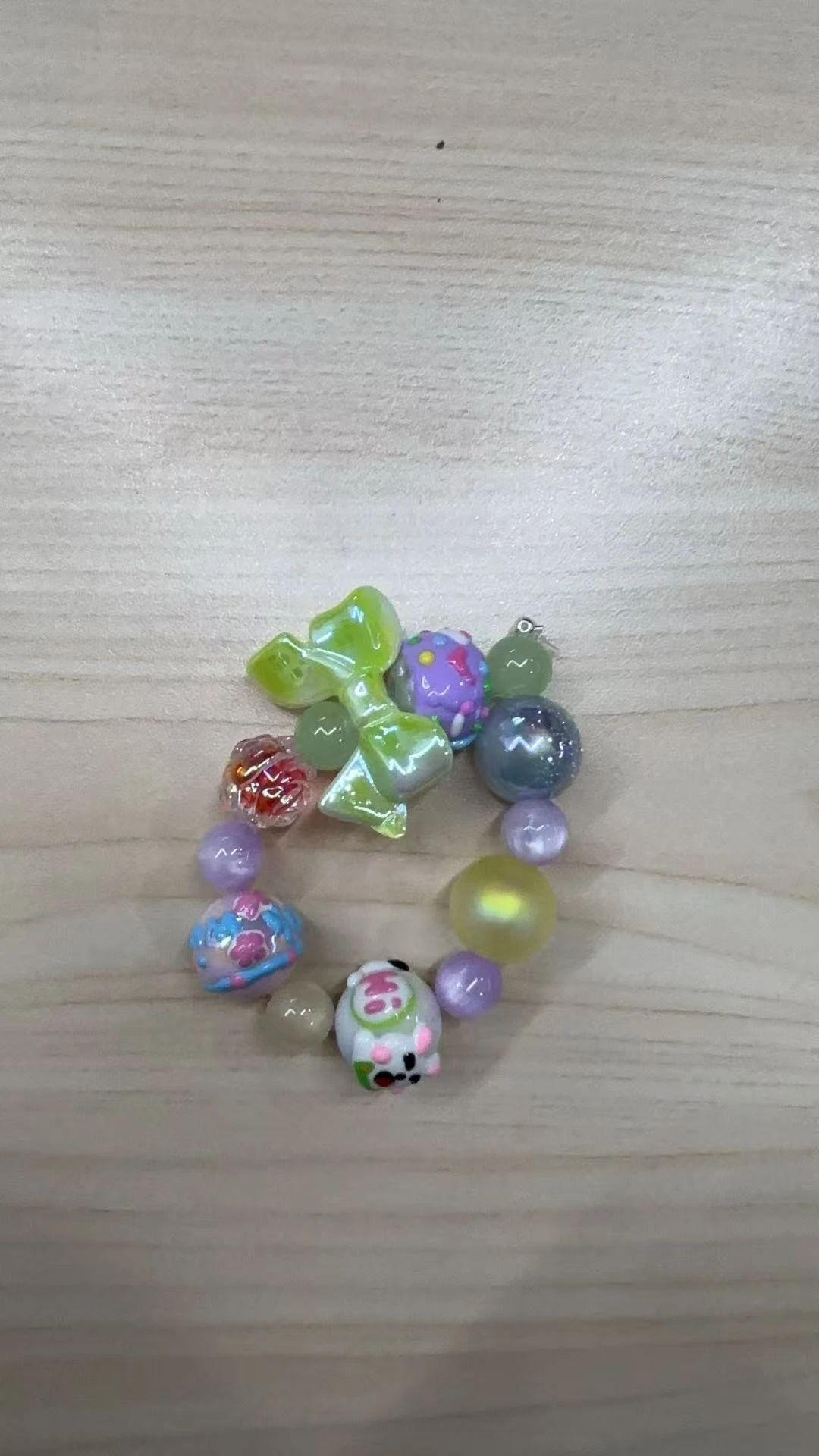 在现代珠宝设计中,手工艺和创意的结合常常能带来令人惊叹的作品。这条充满童趣的手链便是一个绝佳的例子。色彩缤纷的珠子设计各异,每颗珠子似乎都在述说着一个童话故事。绿色的蝴蝶结形状珠子、粉色和紫色的圆珠,以及印有花卉图案的珠子,共同构成了一幅充满活力和幻想的画面。