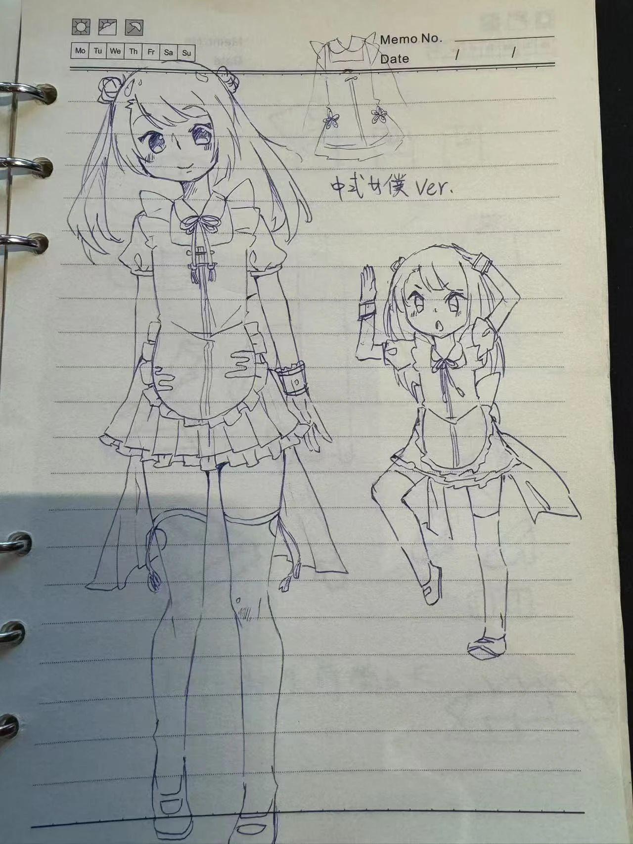 这幅手稿展现了角色设计中一种独特的文化与时尚的交融。角色服装结合了现代设计元素和传统服饰特点,以流畅的线条和细腻的细节传达出角色的活泼与灵动。通过对这幅作品的深入分析,可以发现羽绒服设计中丰富的灵感来源。设计师可以从中提炼出蝴蝶结和褶边作为羽绒服的细节点缀,同时在面料的选择上融合现代与传统的色彩与纹理,创造出一种既保暖实用又具有深厚文化内涵的冬季外套。作品中的情感表达和文化背景为羽绒服的创作提供了丰富的叙事性,使其不仅仅是一件服饰,更是一种文化艺术的表达。