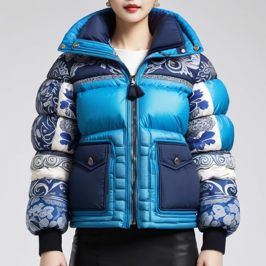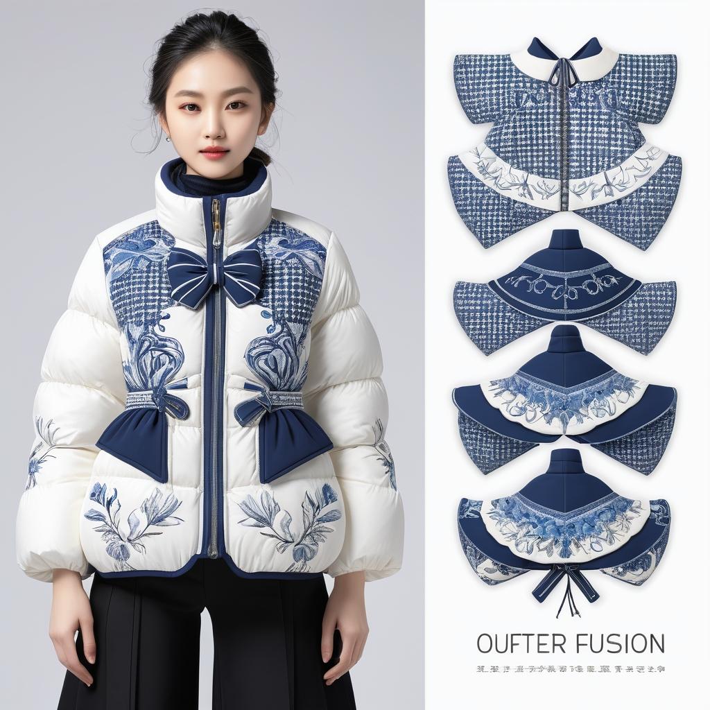 从这幅手稿中可以提取出多种设计灵感,用于羽绒服的创作。首先,角色服装中的蝴蝶结和褶边元素可被转化为羽绒服的装饰细节,成为引人注目的设计亮点。同时,服装结构中的现代与传统元素的结合,可以通过面料和色彩的搭配在羽绒服中重现,营造出一种既时尚又充满文化深度的风格。角色的流畅线条和柔和色调可以体现在羽绒服的剪裁和面料选择上,强调舒适性与美观性,打造出一种温暖且具有艺术性表达的冬季服饰。