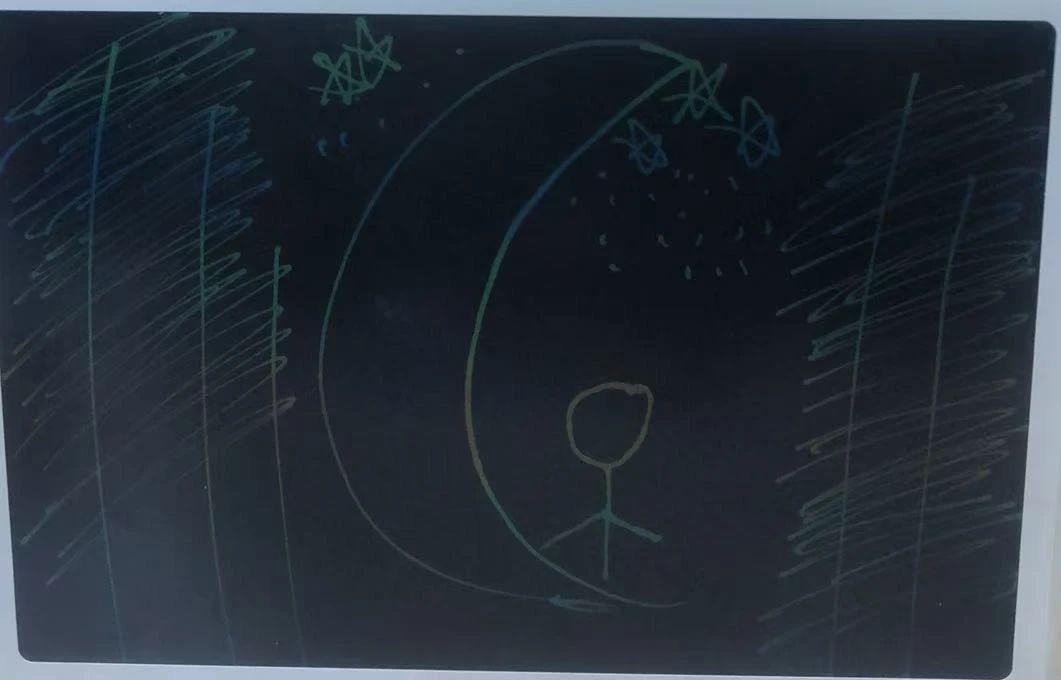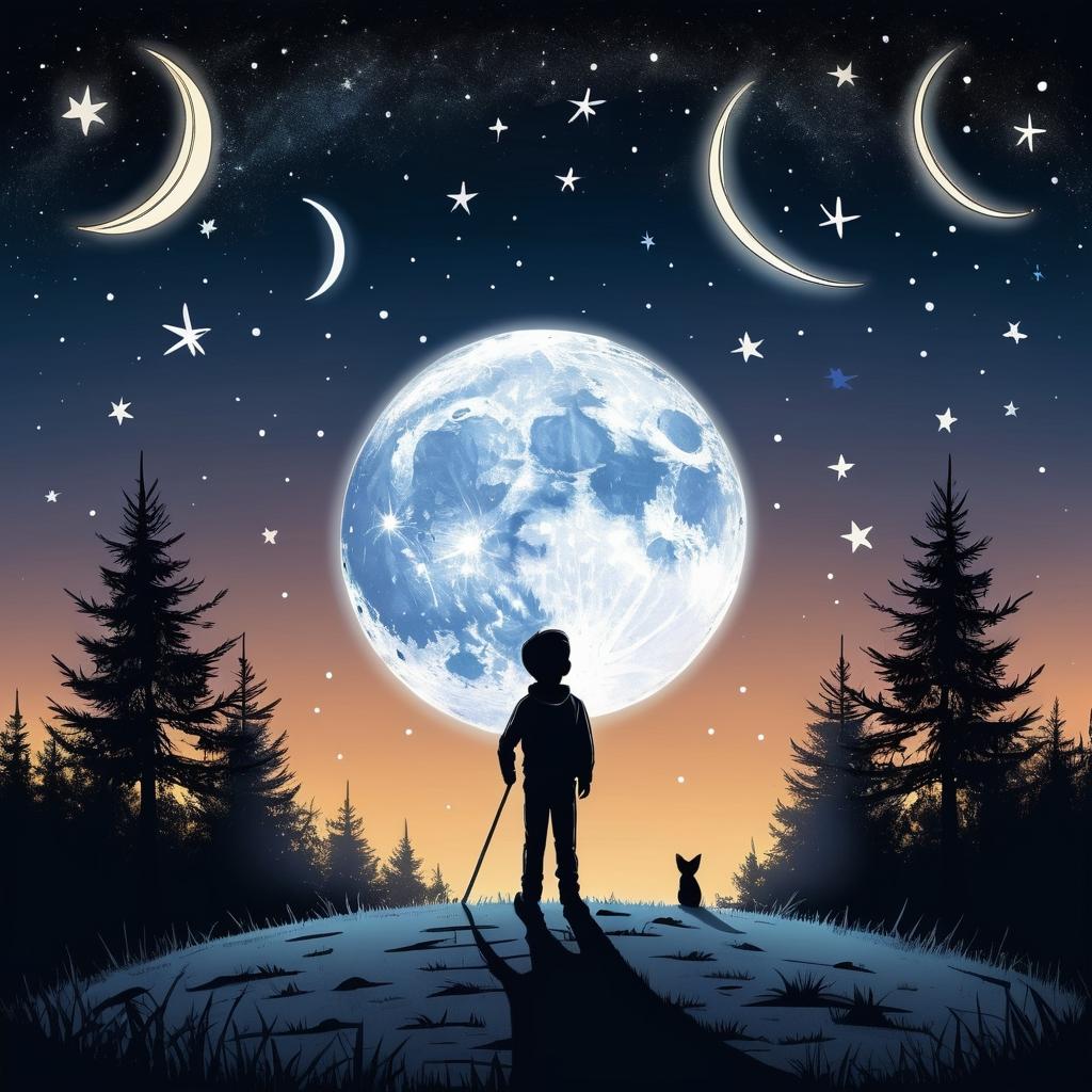 这幅作品展示了一个简单而富有童趣的夜晚场景。画面中央是一轮弯月,旁边有一个简化的人物图形。背景是深色的夜空,点缀着几颗星星。画面两侧有类似树林的线条,整体给人一种宁静且梦幻的氛围。