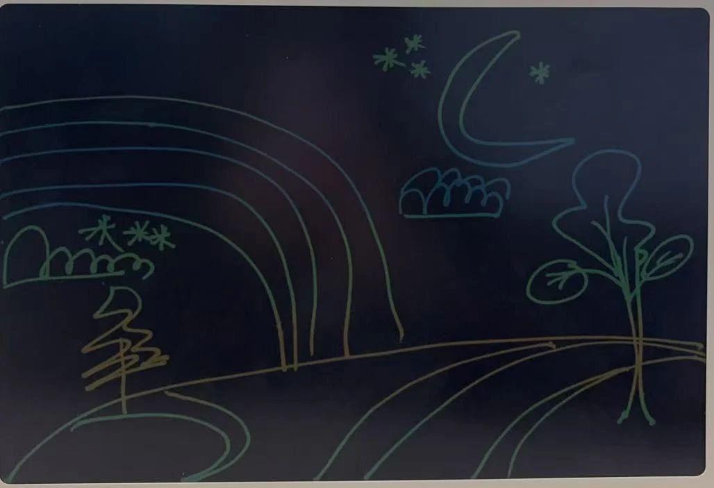 在这幅作品中,我们看到了孩子眼中的夜空世界。简单的线条勾勒出一个充满幻想的夜景,月亮、星星、云朵和树木都被赋予了生命力。柔和的色彩选择让画面充满了宁静与温暖,仿佛是夜晚的宁静与神秘被孩子用画笔轻轻描绘出来。这种风格深受儿童艺术的影响,强调自然和天真。孩子们通过简洁的线条和想象力表达对世界的热爱与好奇。为了使作品更具表现力,可以尝试加入更多的细节元素,如动物或流星,丰富整体画面感。同时,利用色彩层次的变化,增强视觉上的层次感,增加作品的深度。此外,动态元素如流星或飞鸟的加入,也可以为画面增添更多的活力。这不仅能吸引小观众的注意力,也能让成年人感受到孩子的天真与创意。