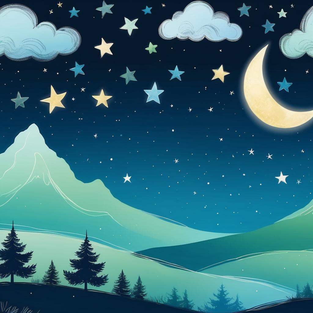 这幅作品使用了简单的线条勾勒出夜空下的风景。画面中有弯曲的月亮、星星、云朵、树木和山丘。色彩主要是柔和的绿色和蓝色,营造出一种宁静的氛围。整体构图简洁且具有童趣,可能表达了对自然夜景的童真和幻想。