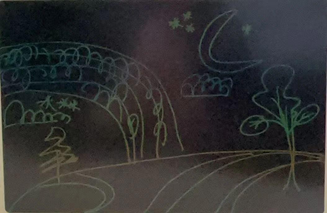 这幅作品展现了夜晚的静谧与梦幻,简单的线条和柔和的色彩使其充满了童真的魅力。在提升这幅作品时,可以考虑加入一些细节,比如增加星星的数量和形状变化,以增强画面的丰富性。还可以在云朵和树木的形态上进行更多的探索,使其看起来更加生动。同时,背景的黑色可以通过渐变或加入小点光源来增加深度,营造出更具层次感的夜空。通过这些调整,作品能够更好地传达夜晚的神秘和梦幻感,激发观众的想象力和情感共鸣。